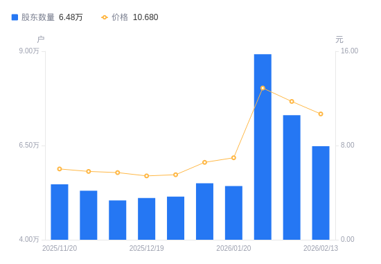 日期A股户数(户)流通A股户均持股数(股)户均持股市值(万元)2026-02-13647989000.449.612026-02-10730277986.239.382026-01-30892286536.198.422026-01-205424110752.217.482026-01-095498910605.956.972025-12-315143911337.916.262025-12-195109811413.576.192025-12-105045211559.726.592025-11-285299611004.816.382025-11-205472310657.516.41