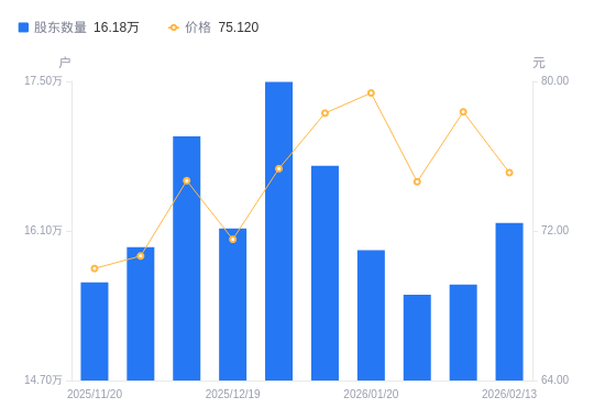 日期A股户数(户)流通A股户均持股数(股)户均持股市值(万元)2026-02-1316175414828.49111.392026-02-1015598515376.91120.512026-01-3015503215471.43115.462026-01-2015920315066.09119.592026-01-0916710814353.03112.382025-12-3117495513709.28103.272025-12-1916123814711.25105.262025-12-1016986013964.51104.302025-11-2815946914874.44105.102025-11-2015617615188.07106.30