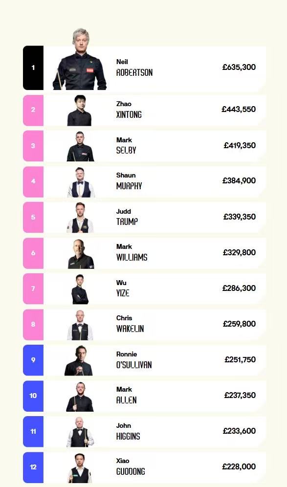 中国球员方面,赵心童排在第5位,肖国栋排在第10位,吴宜泽排在12位,丁俊晖排在15位,斯佳辉排在16位,张安达排在18位