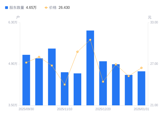 日期A股户数(户)流通A股户均持股数(股)户均持股市值(万元)2026-01-31465003384.008.942026-01-20453003473.648.772026-01-10489003217.928.662025-12-20499003159.807.722025-12-10603002614.837.982025-11-30458003442.669.902025-11-10462003412.868.192025-10-31542002909.127.792025-10-10509003097.728.682025-09-30520923026.848.23