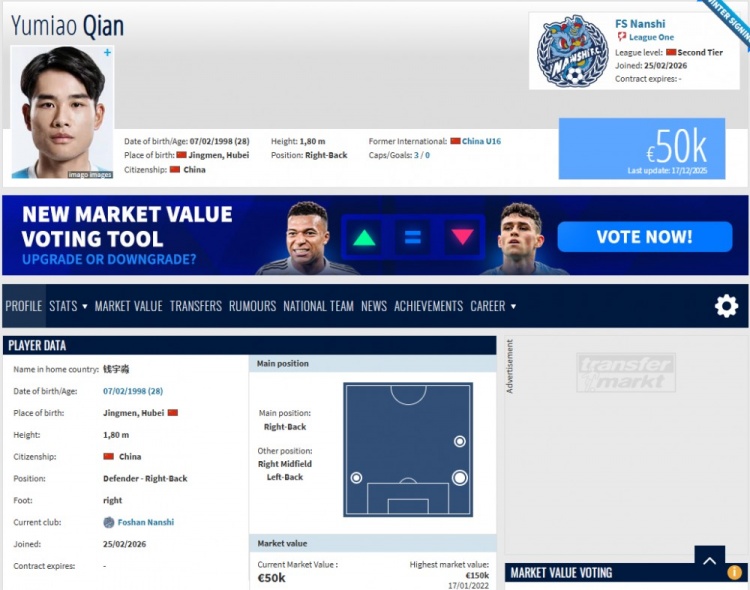直播吧2月25日讯2026赛季开始前,钱宇淼离开了效力多年的天津津门虎。“德国转会市场”网站信息显示,钱宇淼已经以自由转会的方式加盟中甲球队佛山南狮。