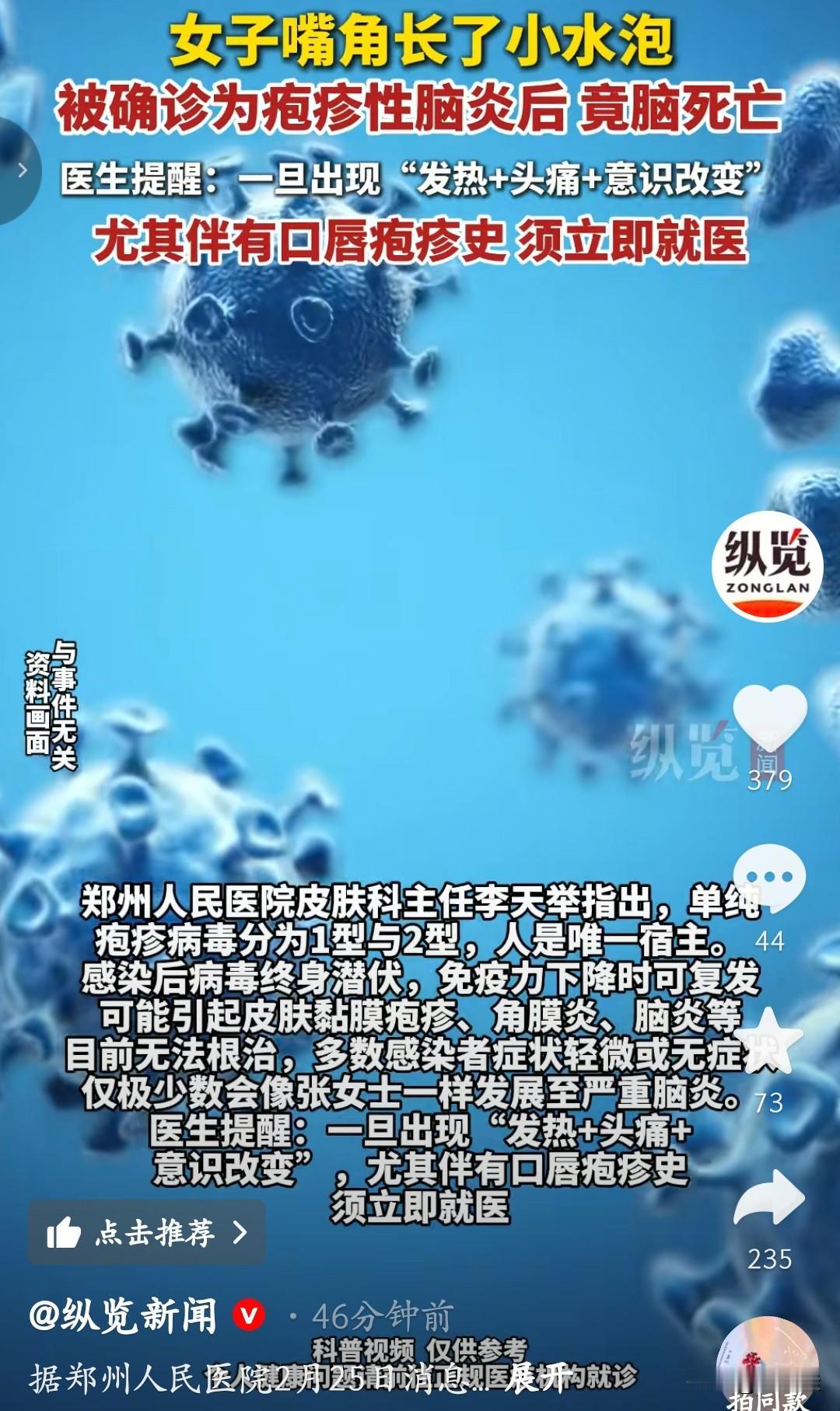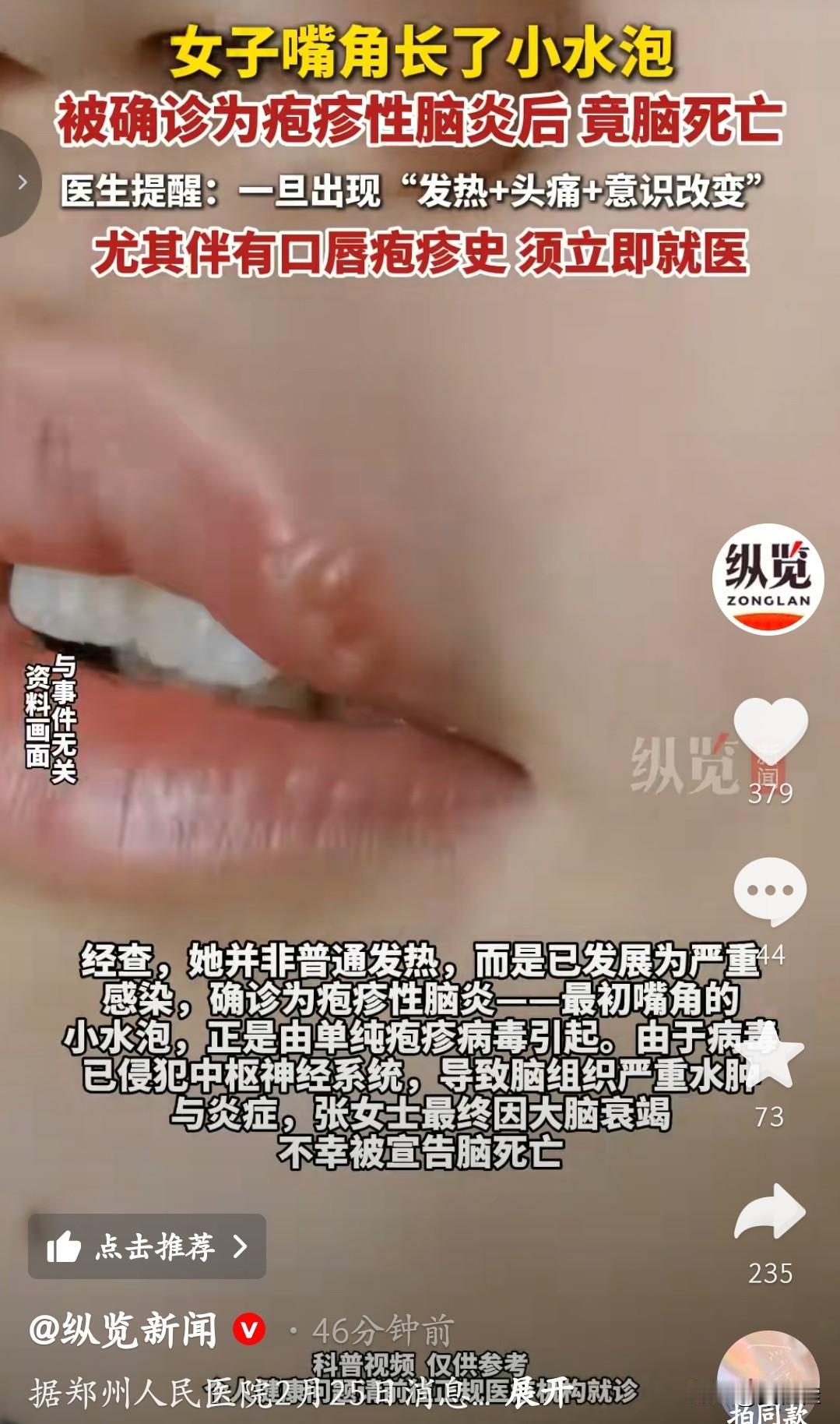 你敢相信吗?仅仅因为嘴上的小水泡,30多岁的女子被宣告脑死亡。 陕西这位张女士,一开始只是嘴角刺痛,长了些小水泡。她以为是天气干燥上火,就是普通的“烂嘴角”,没当回事,自己涂了点消炎药膏就不管了。 可情况根本没好转,水泡越涨越大,她还开始发高烧、浑身没力气。她依旧没去医院,只买了退烧药吃。到了晚上,嘴角伤口红肿得更厉害,还出现了剧烈呕吐的症状,家人才赶紧把她送医。 检查结果出来,所有人都懵了。这根本不是普通上火,而是单纯疱疹病毒引发的疱疹性脑炎。病毒已经侵犯到中枢神经系统,导致脑组织严重水肿发炎,最终张女士因大脑衰竭,被宣告脑死亡。 真的别把身体的小信号当儿戏!很多时候那些看似不起眼的“小毛病”,背后都藏着大隐患。身体不舒服别硬扛,该就医就及时就医,对自己的健康负责,才是最稳妥的选择。