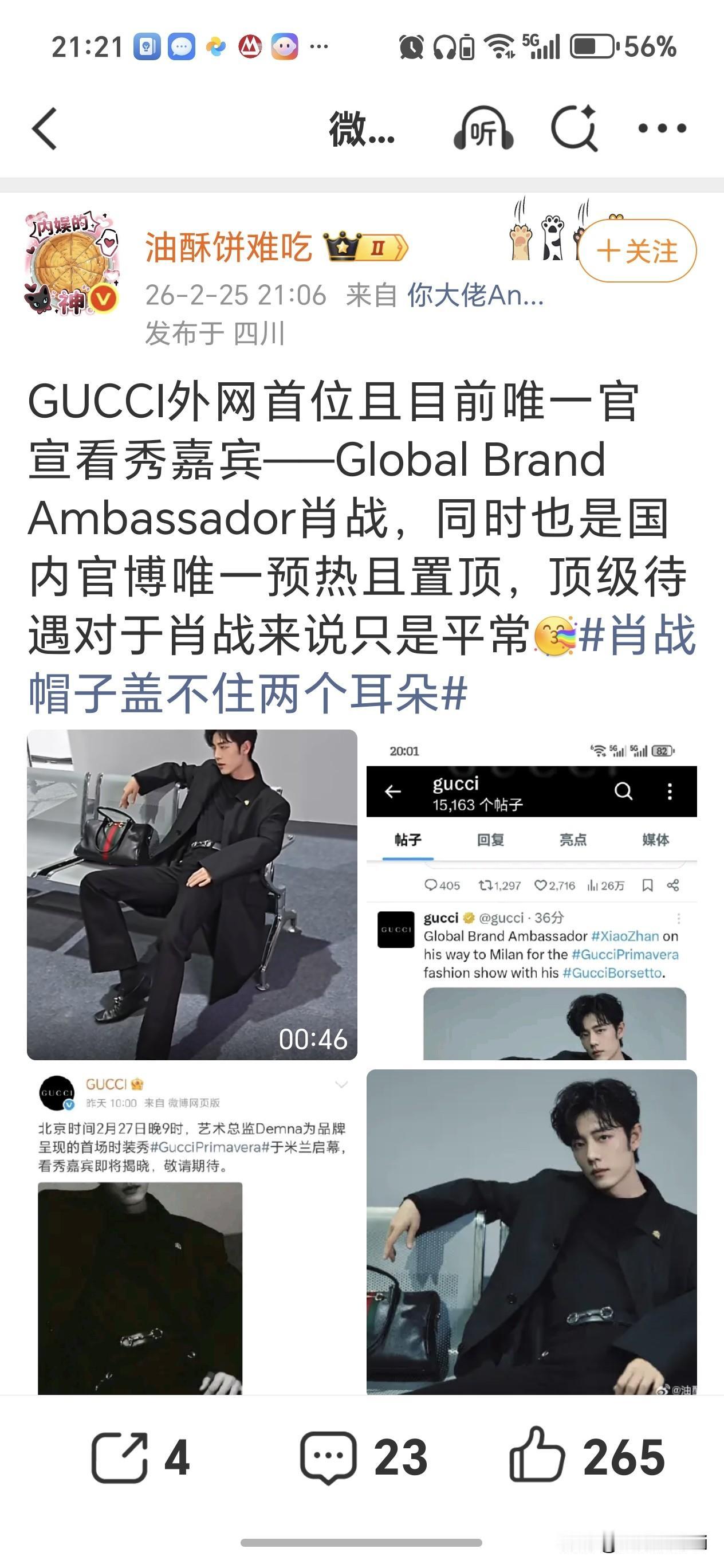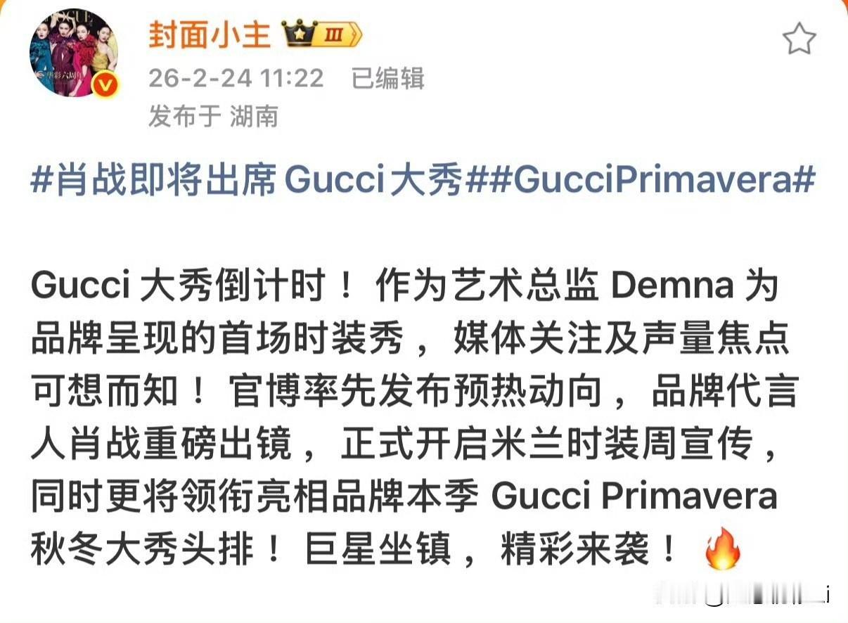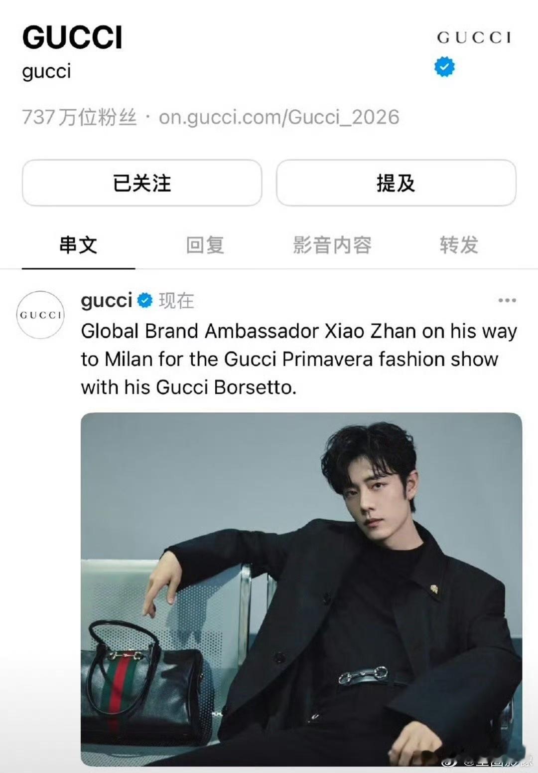 时尚圈只有肖战出现是不会被任何国家的明星压的,肖战在时尚圈的待遇是世界最顶级的,也是内娱历史唯一一个。Gucci大秀已经出发的世界各地的代言人,大使,挚友和明星多的数不清,但Gucci全网只发了肖战一人,而且是置顶宣发,全平台宣发,这就是肖战在世界时尚圈的顶级咖位,和品牌方对肖战的认可和尊重
