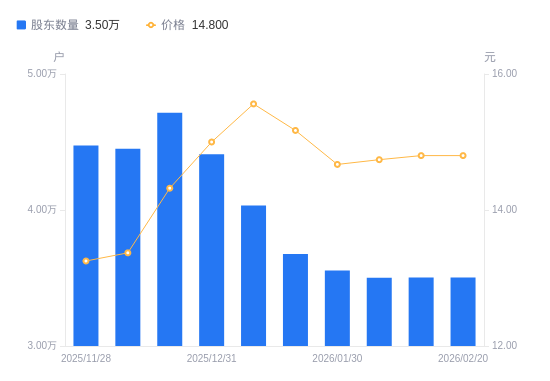 日期A股户数(户)流通A股户均持股数(股)户均持股市值(万元)2026-02-133503714126.6920.912026-02-103501414135.9720.842026-01-303554813923.6220.432026-01-203676113464.1820.432026-01-094033212272.0619.102025-12-314409911223.7716.842025-12-194715810495.7115.032025-12-104451111119.8814.872025-11-284473911063.2114.662025-11-204423311189.7614.57