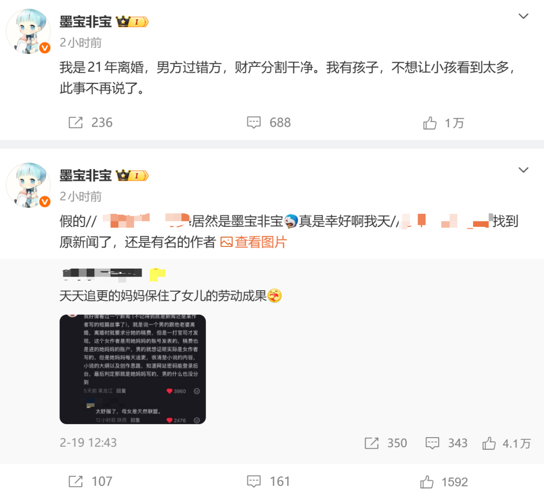 2月25日,知名作家、编剧墨宝非宝发文:我是21年离婚,男方过错方,财产分割干净。我有孩子,不想让小孩看到太多,此事不再说了。