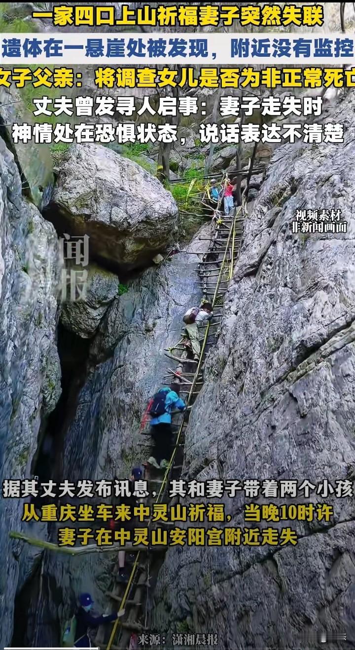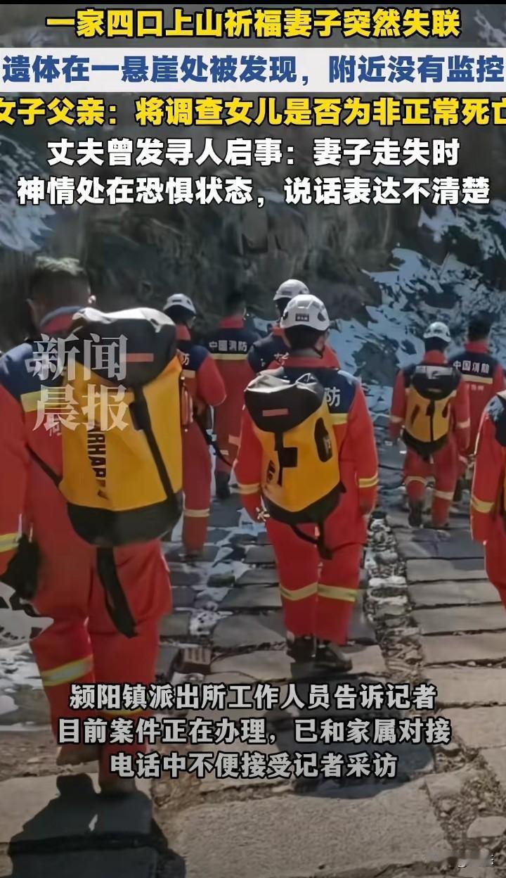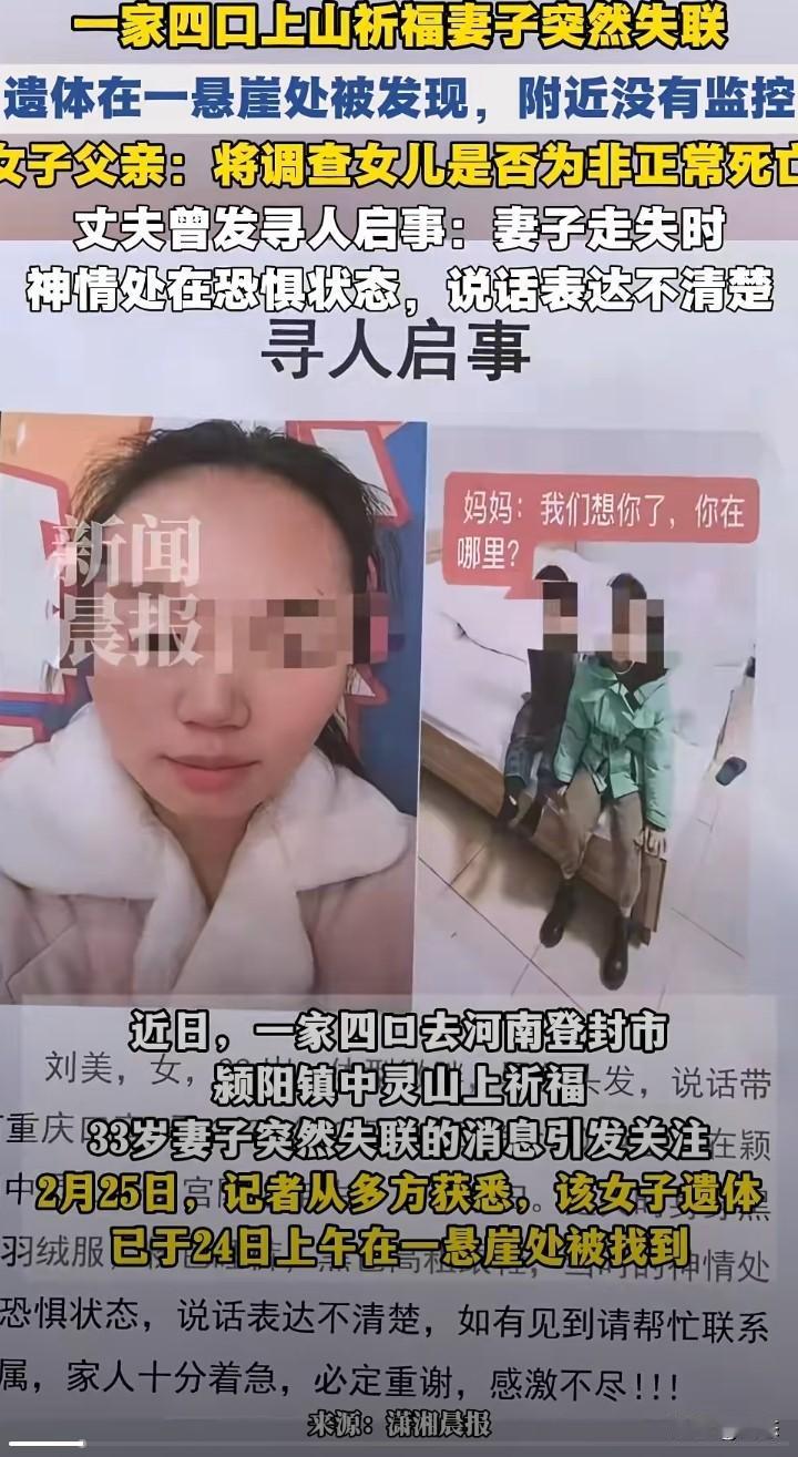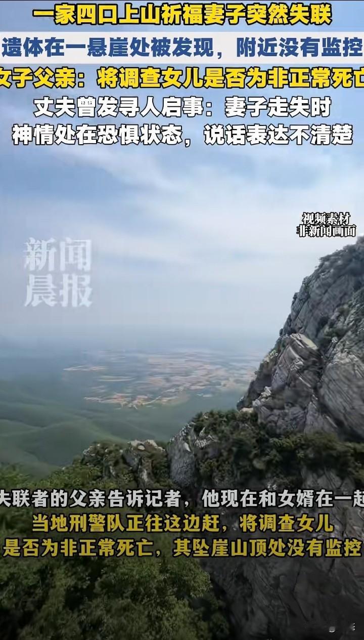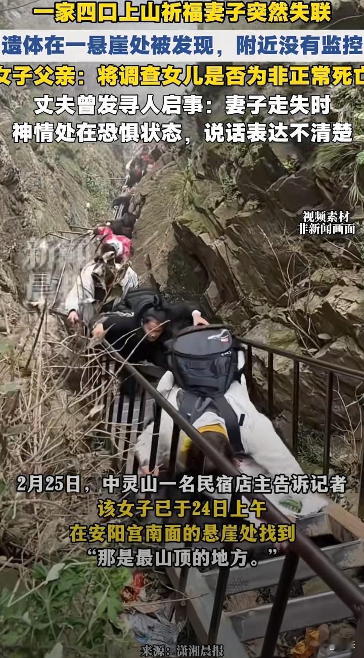 一家四口上山祈福妻子突然失联,家属发布寻人启事。不幸的事,女子在失联10天后,2月24日在悬崖边上找到,找到后人已经没有生命体征。 女子的父亲,将调查女子是否是非正常死亡。女子的丈夫称,走失时,女子神情处于恐惧状态,说话表达不清楚。 由于没有监控,案件还在进一步调查之中,不管是意外还是什么,希望大家以通报为主。 在这里提醒大家,爬山一定要注意安全。