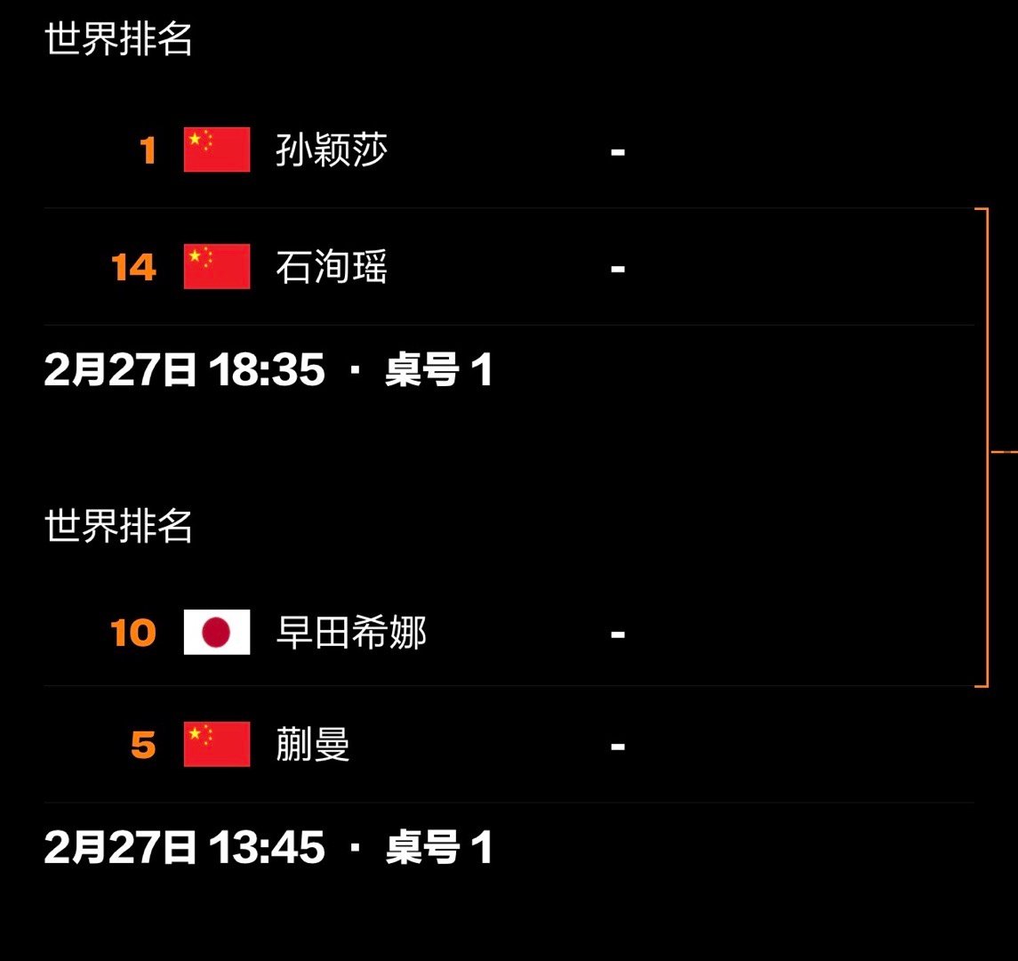 2026新加坡大满贯女乒16强中国队🇨🇳:孙颖莎 王曼昱 陈幸同 蒯曼 王艺迪 陈熠 石洵瑶(7)日本队🇯🇵:张本美和 伊藤美诚 早田希娜 桥本帆乃香 大藤沙月 长崎美柚(6)