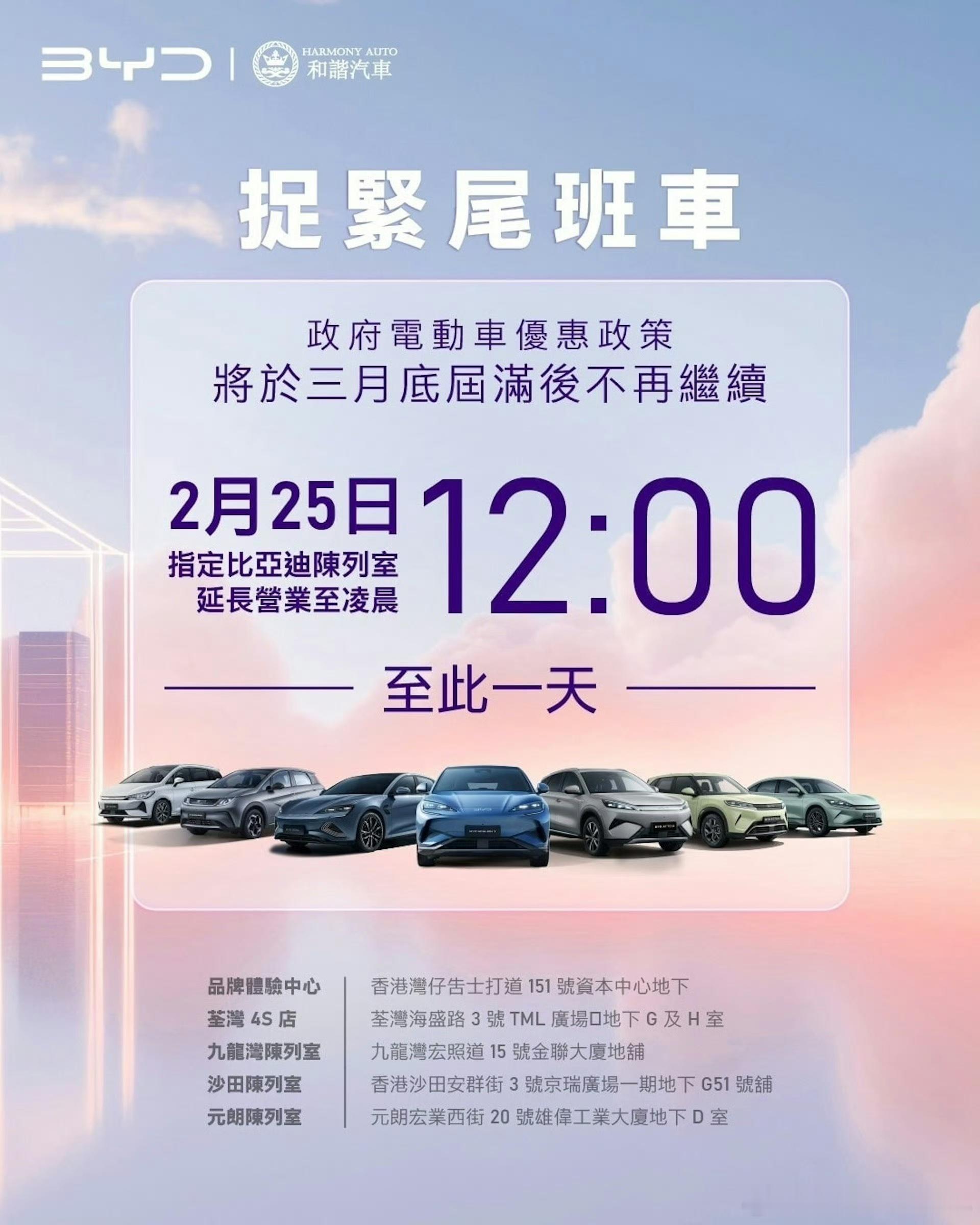 香港本地电动车优惠政策今晚结束,比亚迪小鹏直接延长营业到12点,务必赶上最后一班车