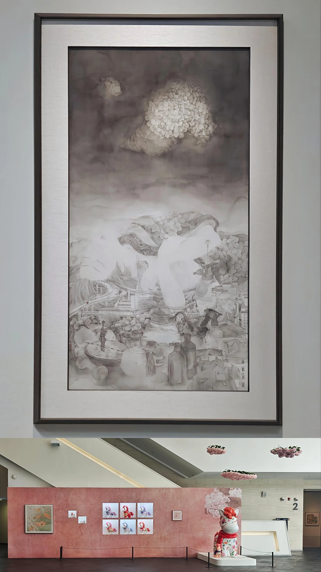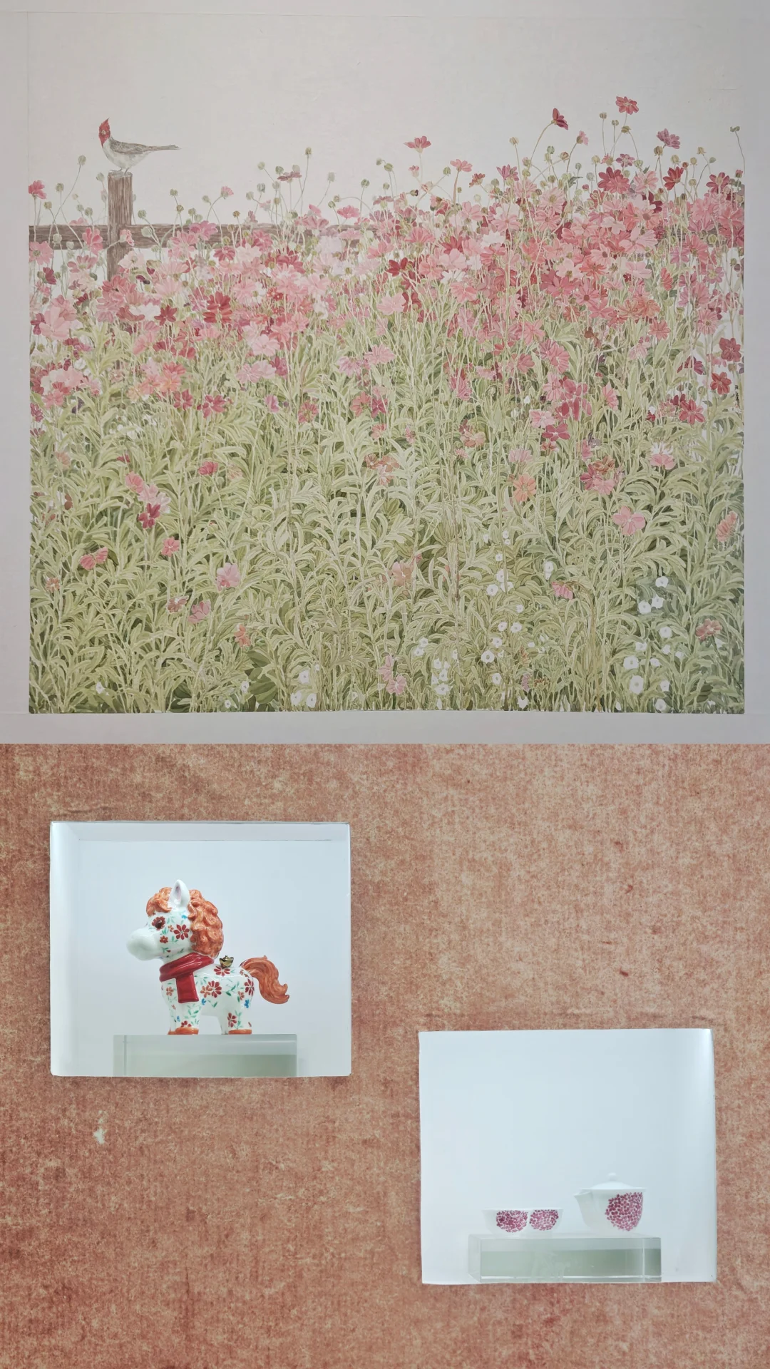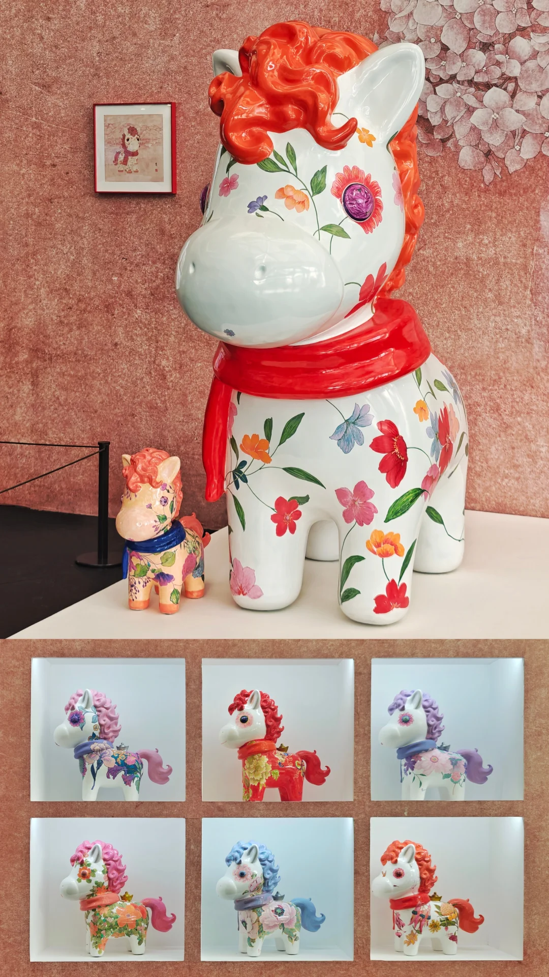 马年贺岁新作《春山锦驹》尤为亮眼,繁花覆身的小马驹伫立于春山之前,萌态可掬,将新春的美好寓意与国画笔墨完美结合。大厅一侧,展厅门口还打造了根据这幅作品衍生的大型艺术装置小马,还有缩小版的瓷小马雕塑文创《福骁迎春》亮相,十分可爱,也是合影打卡点。