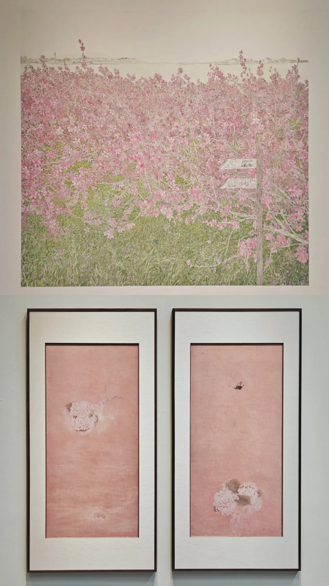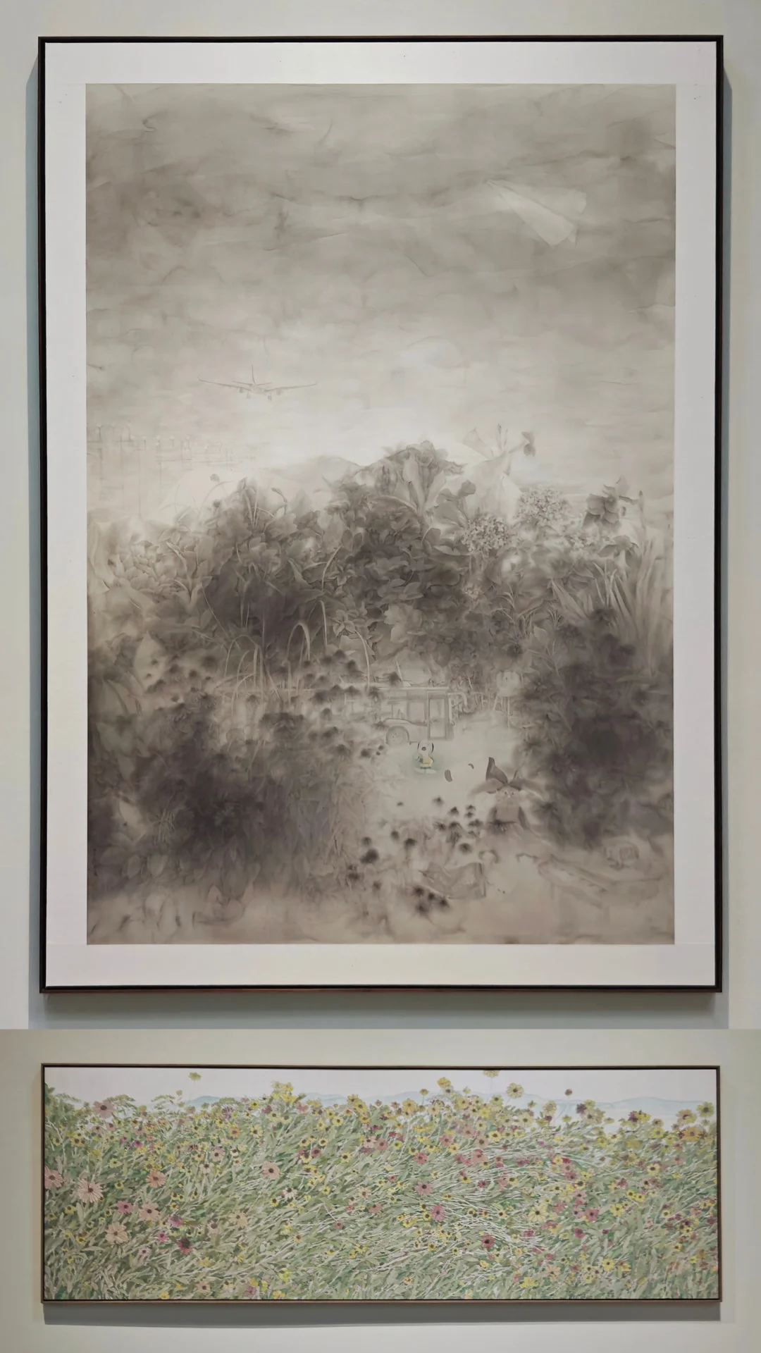▫️《溪山图》超大尺幅纸本设色作品,耗时一年,水渍法叠加印象派点彩法,融合《溪山行旅图》结构和缤纷花鸟,致敬传统又实现艺术创新。