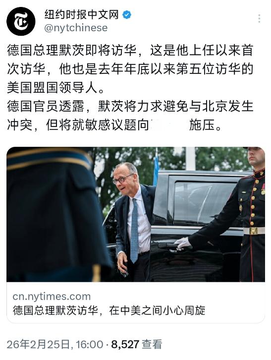 纽约时报中文网 2 月 25 日写道,德国总理默茨访华,在中美之间小心周旋。德国总理默茨即将访华,这是他上任以来首次访华,他也是去年年底以来第五位访华的美国盟国领导人。德国官员透露,默茨将力求避免与北京发生冲突,但将就敏感议题向中国施压。 2 月 25 日,默茨按照既定行程抵达北京,开启为期两天的正式访问,这次访问是他就任总理后第一次来到中国,行程安排紧凑,双方高层会就双边关系以及共同关心的国际问题交换意见。 从近期欧洲多国领导人接连访华的情况来看,德国此次安排访问,也延续了欧洲国家希望和中国保持沟通、稳定关系的整体趋势。 德国方面在访前已经释放出明确信号,一方面希望和中国保持稳定对话,不希望双边关系出现对立,另一方面也会按照德国国内的政治立场,在一些双方存在分歧的议题上表达自身看法。 这种做法,本质上是德国在当前国际环境中,试图平衡多方关系、维护自身利益的选择。 默茨此行还带着规模较大的德国企业代表团,涵盖汽车、化工、机械制造等德国优势领域。 德国经济界高度重视中国市场,希望通过高层访问推动经贸合作,这也是德国政府推动访问的现实考量。 德国官方多次表示,不认同和中国脱钩的做法,认为脱钩会损害德国自身利益,中国在全球经济和国际事务中发挥着重要作用,无法被忽视。 在中美关系复杂的背景下,德国作为美国的盟友,同时又和中国有着深度经贸往来,在处理对华关系时需要兼顾多方因素。 默茨政府的对华策略,既希望维持和美国的同盟关系,也不愿意放弃和中国的合作空间,因此在访问中采取谨慎务实的态度,既保持沟通,也不回避分歧。 中方对此次访问持积极态度,愿意同德方坦诚交流,在尊重彼此核心利益和重大关切的基础上,扩大合作、管控分歧。 中德同为具有重要影响力的国家,保持稳定的双边关系,不仅符合两国的共同利益,也有利于欧洲和世界的稳定。 默茨此次访华,是德国对华政策走向务实的体现,也是大国之间通过对话化解分歧、推进合作的一次重要实践。 以上都是个人观点,对此您有什么不同的看法,可以在评论区留言讨论!!!