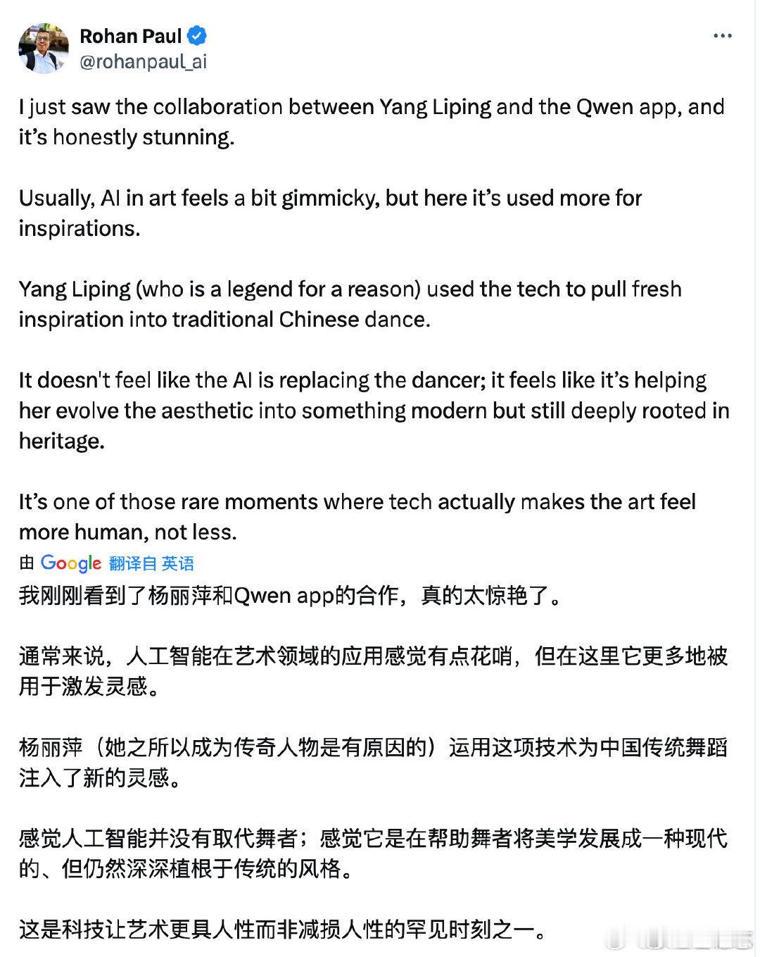 美国AI大牛盛赞杨丽萍千问节目以艺术为骨,以千问为翼,让中国风骨震撼全球,这才是文化与科技的顶级双向奔赴!