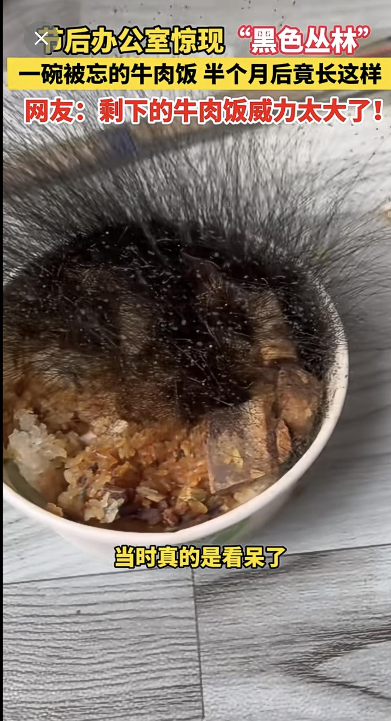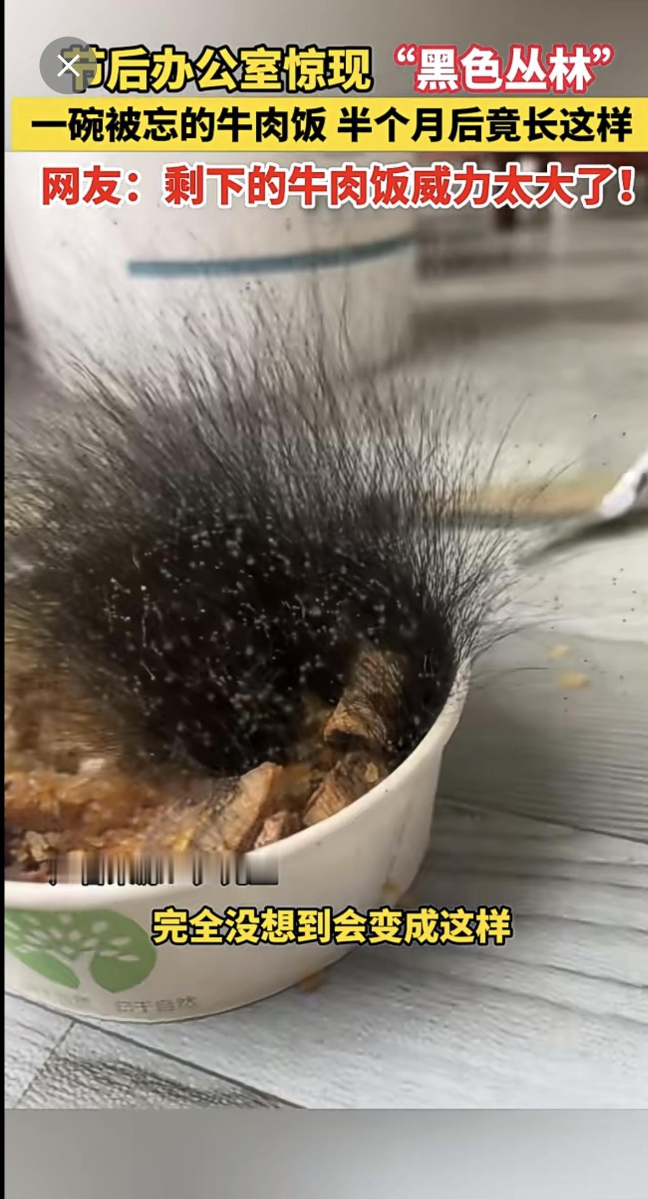 节后办公室惊现“黑色丛林”! 一碗被忘的牛肉饭,半个月后竟长这样 网友:剩下的牛肉饭的威力太大了! 节后回到办公室,你第一件事会做什么?合肥巢湖的尹先生,这个春节回老家过年,却把一碗给小狗吃剩下的牛肉饭忘在了办公室。当他节后返回单位,推开办公室门就闻到一股刺鼻的霉味。循着味道找去,眼前的一幕让他惊呆了:那碗被遗忘半个月的牛肉饭,早已面目全非。碗口之上,密密麻麻竖起了黑色菌丝,像头发一样,高度足有15公分左右,宛如一碗微型的“黑色丛林”。(合肥晚报-合新闻记者 文字:马丰成/剪辑 :王艳/编发 :郭筱筱/出品:姗姗不迟到融媒体工作室)