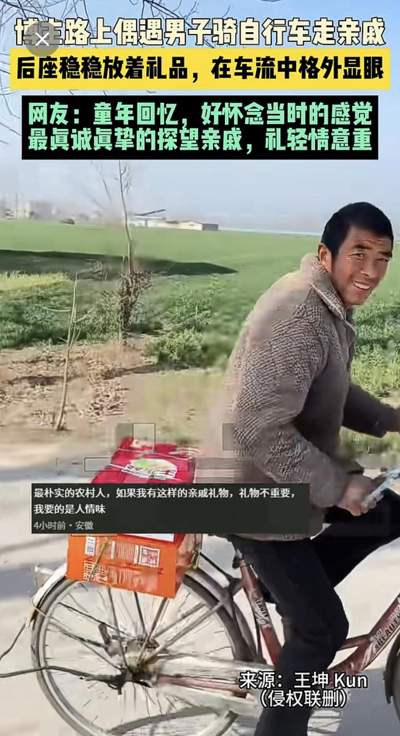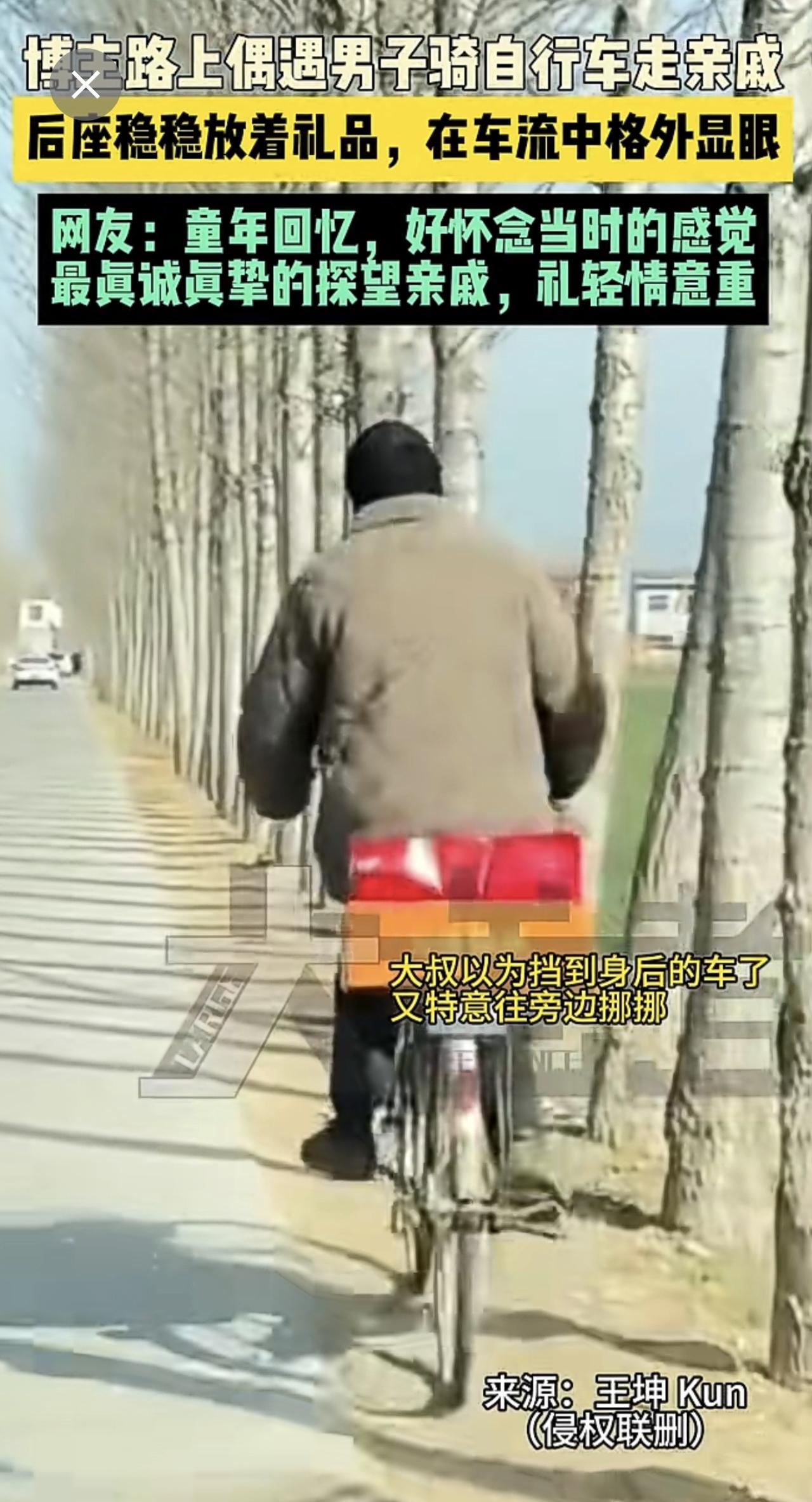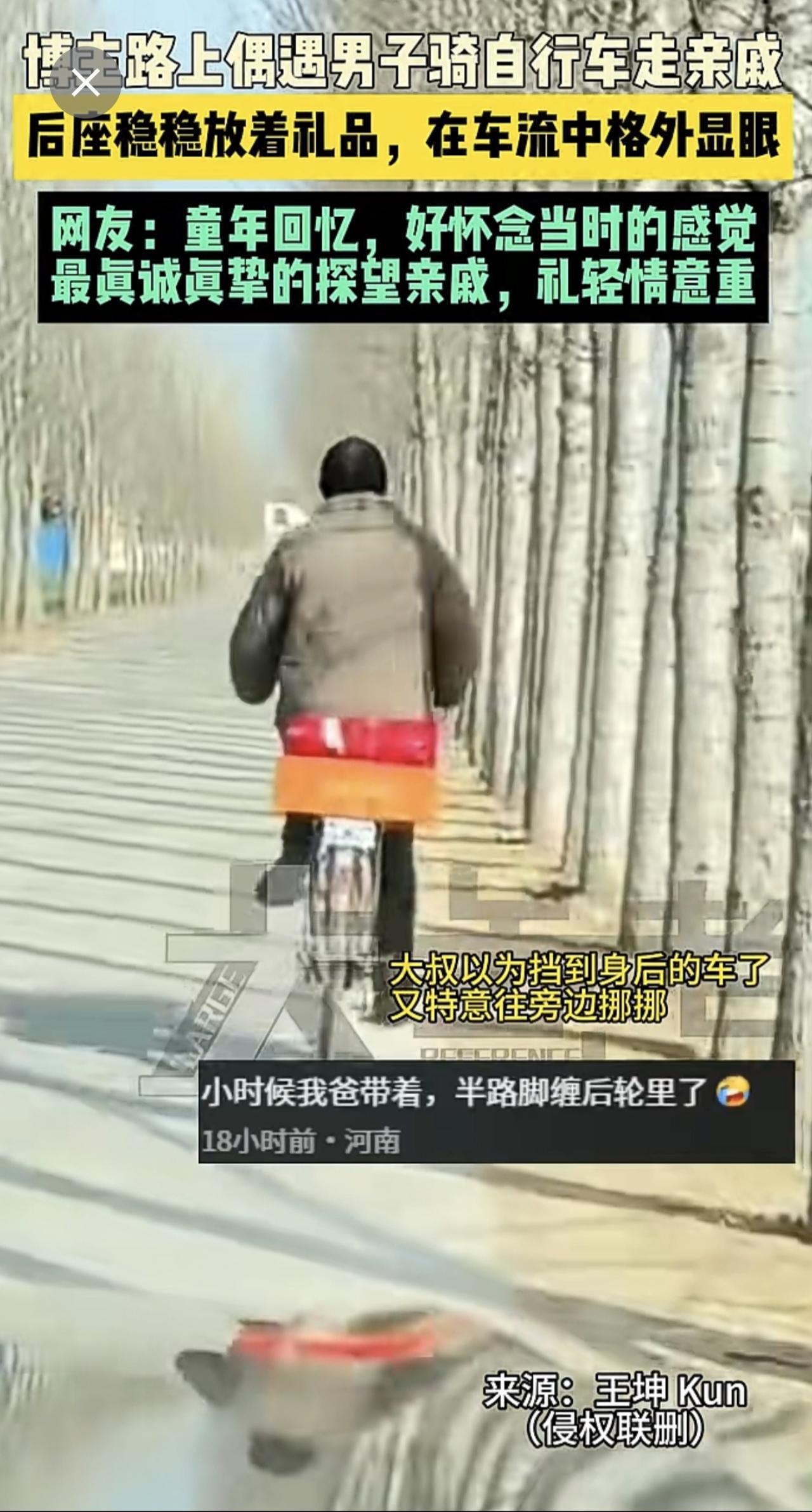 近日河南 (发布)博主路上偶遇男子骑自行车走亲戚,后座稳稳放着礼品,在车流中格外显眼,网友:童年回忆,好怀念当时的感觉,最真诚真挚的探望亲戚,礼轻情意重。