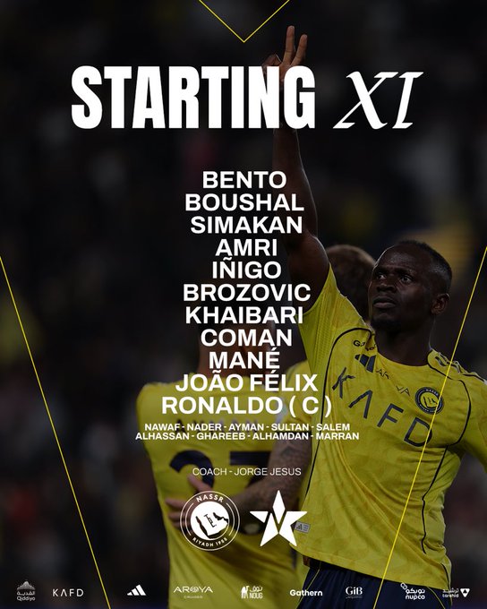 利雅得胜利首发:24-本托、12-布沙尔、3-西马坎、26-伊尼戈-马丁内斯、5-阿姆里、17-哈巴利、11-布罗佐维奇、21-科曼、10-马内、79-菲利克斯、7-C罗
