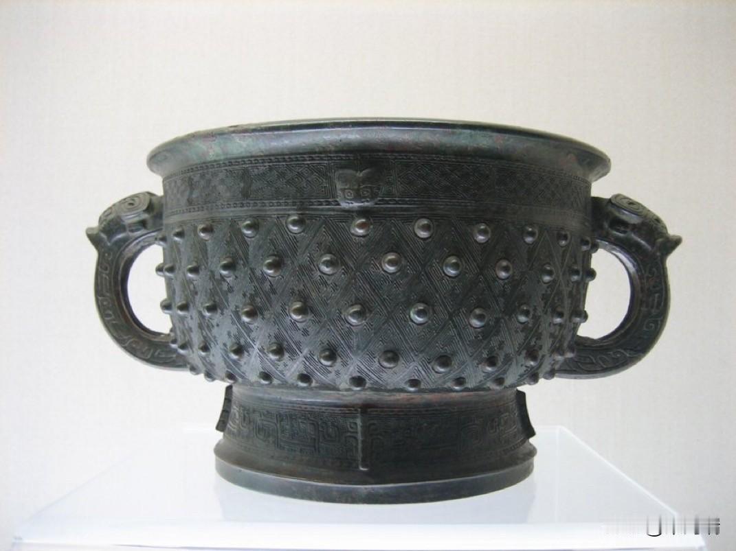 戈父丁簋,是一件产于商代晚期的青铜礼器。 详细信息 名称: 戈父丁簋(Gefuding Gui)。 用途: “簋”是中国古代用于盛放谷物(如米、粟、高粱等)供奉祭祀的礼器。 年代: 商代晚期(约公元前1300年至公元前1050年)。 器型特征: 器身为碗状,带有两个兽首耳。 腹部装饰有显著的乳钉纹(由斜线组成的菱形格中,每个格子中心有一个凸起的圆点)和雷纹。 口沿下方饰有雷纹,前后中央各有一个浮雕兽首。 圈足部饰有乳钉纹、雷纹及鸟纹。 铭文: 器腹内铸有“戈父丁”三字铭文,表明该器物是戈氏家族为祭祀“父丁”而制作的。