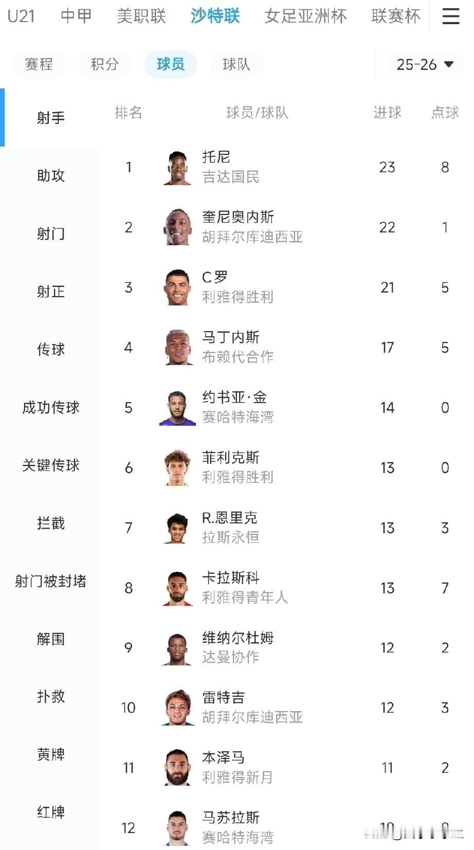 沙特联赛又变天了。 刚刚几轮,像过山车。 利雅得胜利从落后榜首7分到2分优势领跑榜单。这是追了9分。 再反观利雅得新月在引进本泽马后却从榜首滑落到第三名,落后榜首3分,丢了10积分。 看一看,射手榜与助攻榜,利雅得胜利的攻击群还是可以的,比起利雅得新月是抢眼不少。怪不得本泽马能转会利雅得新月,利雅得新月缺攻击手。 不过,榜单之外,我们还是要分析比赛,马内的回归是很大的关键,可以说,马内才是榜单之外的幕后英雄。 联赛,还长,本泽马能否展现转会利雅得新月的威力是很关键的一环,毕竟,利雅得新月还有亚冠赛事,两线作战很考验球队的耐力以及意志力。应对不好,就是两线皆崩。 亚冠,过早被淘汰,联赛落后,追分困难,是很尴尬的。 现在利雅得胜利已经在联赛早早建立优势,对于联赛后期是有利条件。