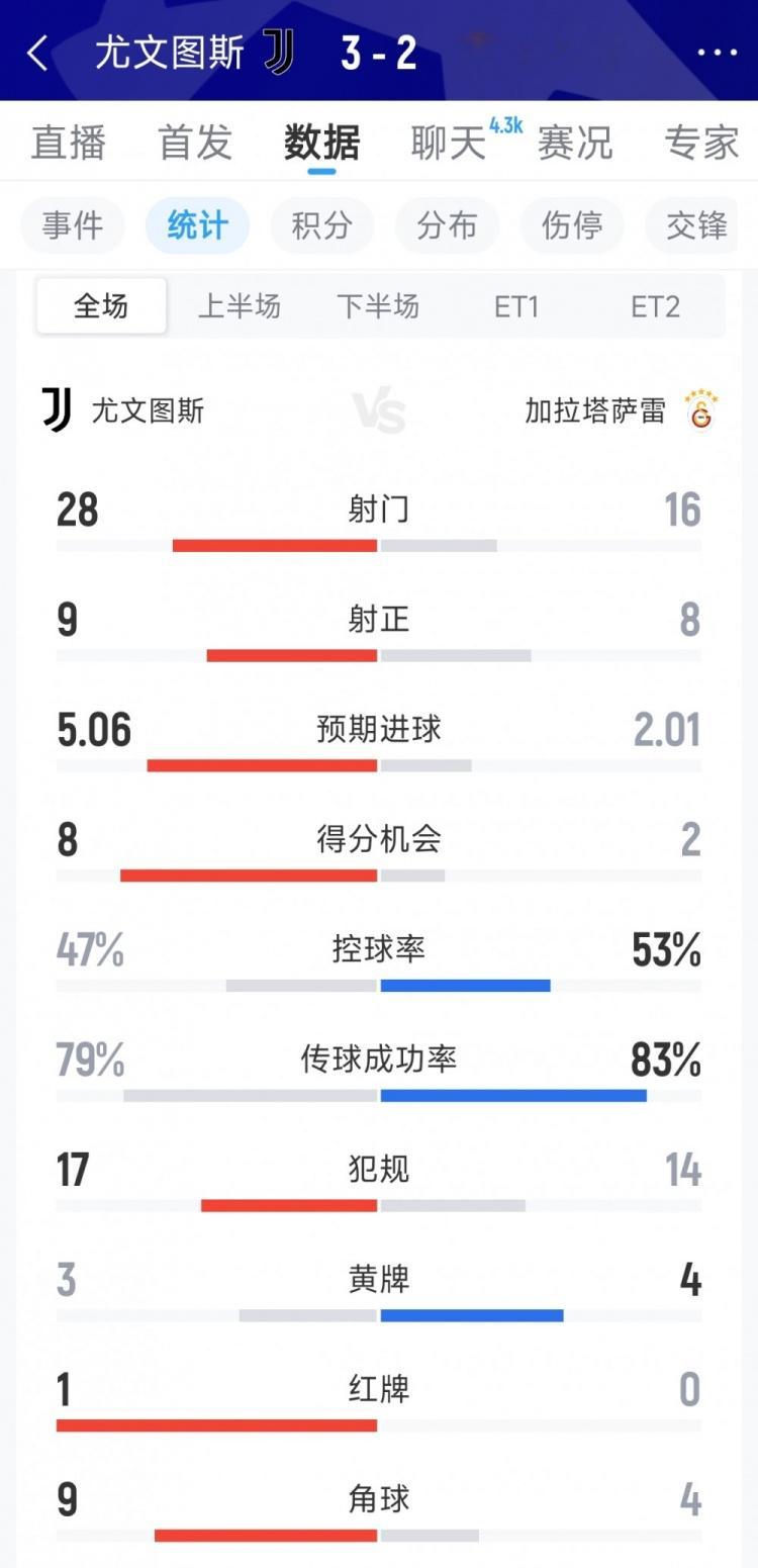 直播吧2月26日讯在欧冠淘汰赛附加赛次回合,尤文经历加时赛3-2击败加拉塔萨雷,但仍遭淘汰。以下为双方120分钟数据对比: