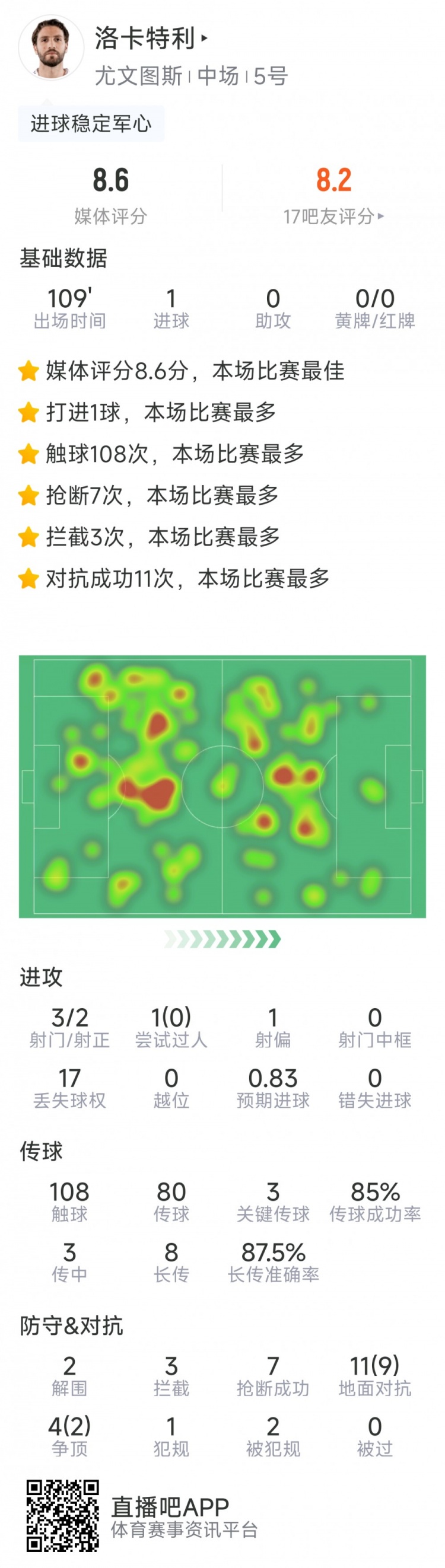 直播吧2月26日讯在本轮欧冠淘汰赛附加赛,尤文3-2击败加拉塔萨雷,以下为洛卡特利本场数据: