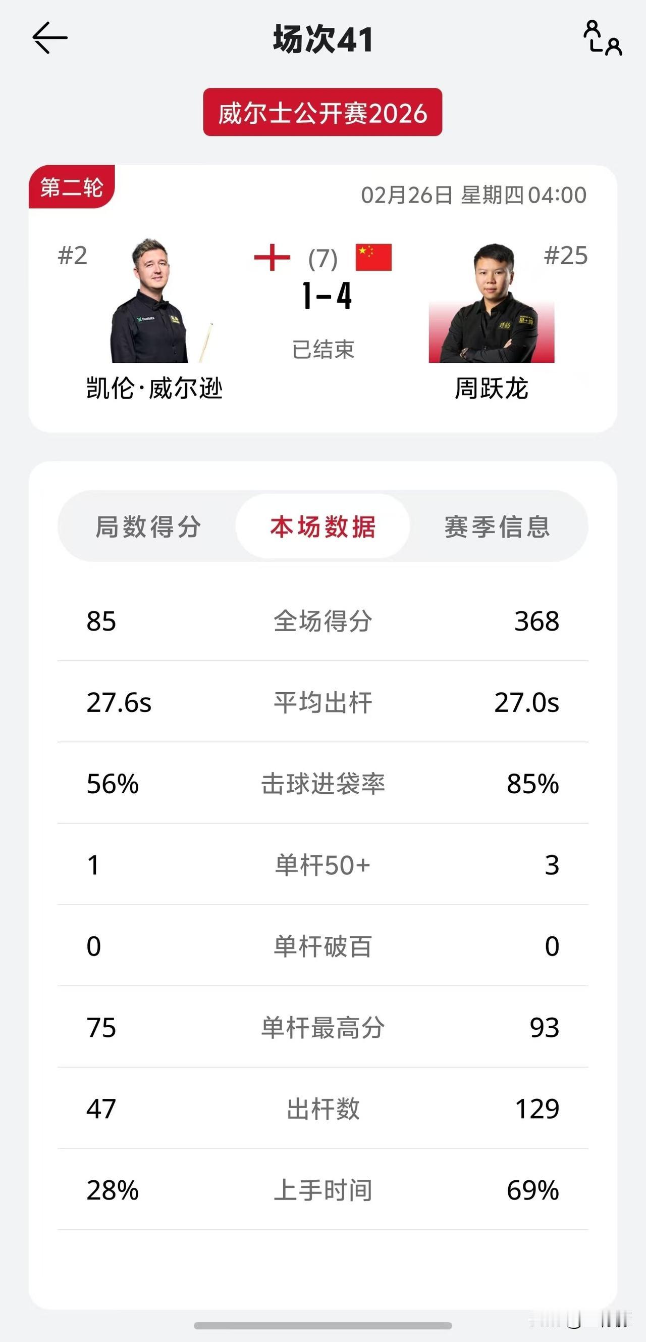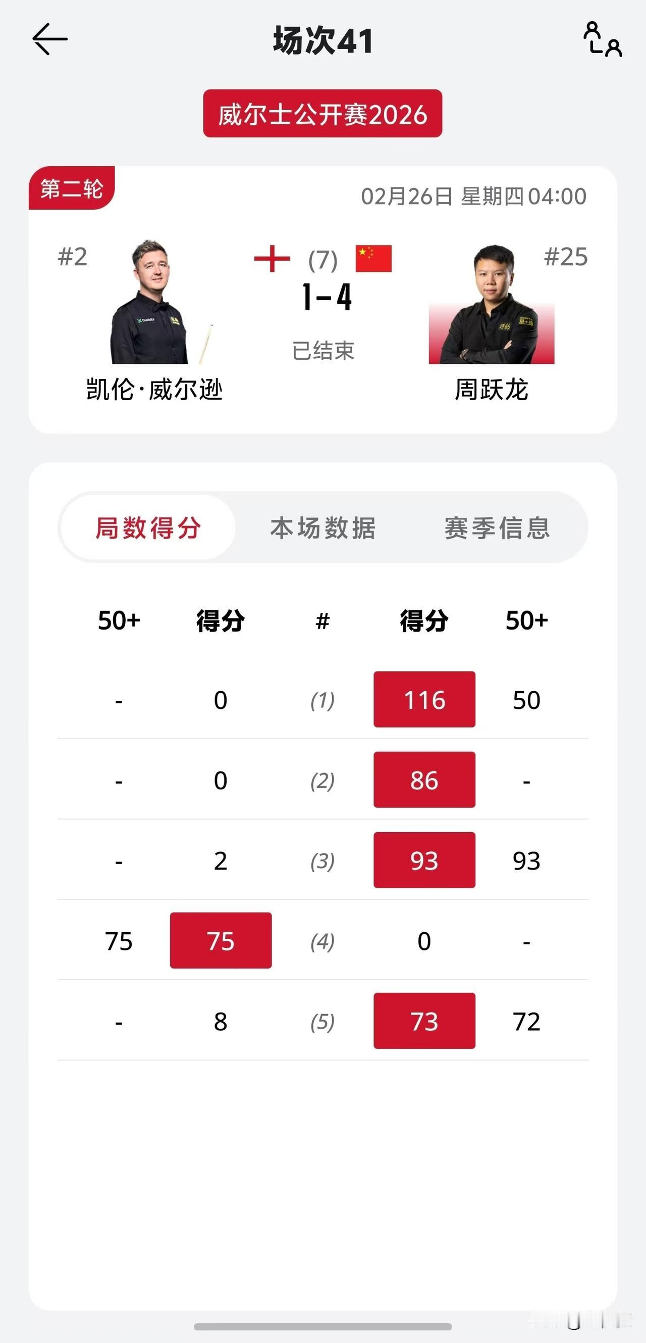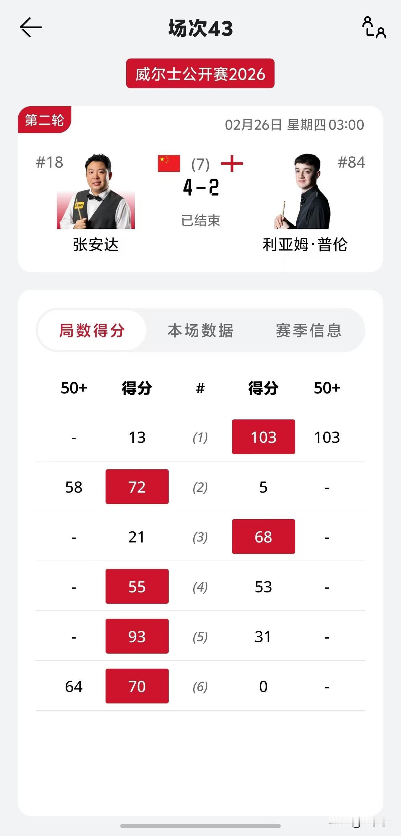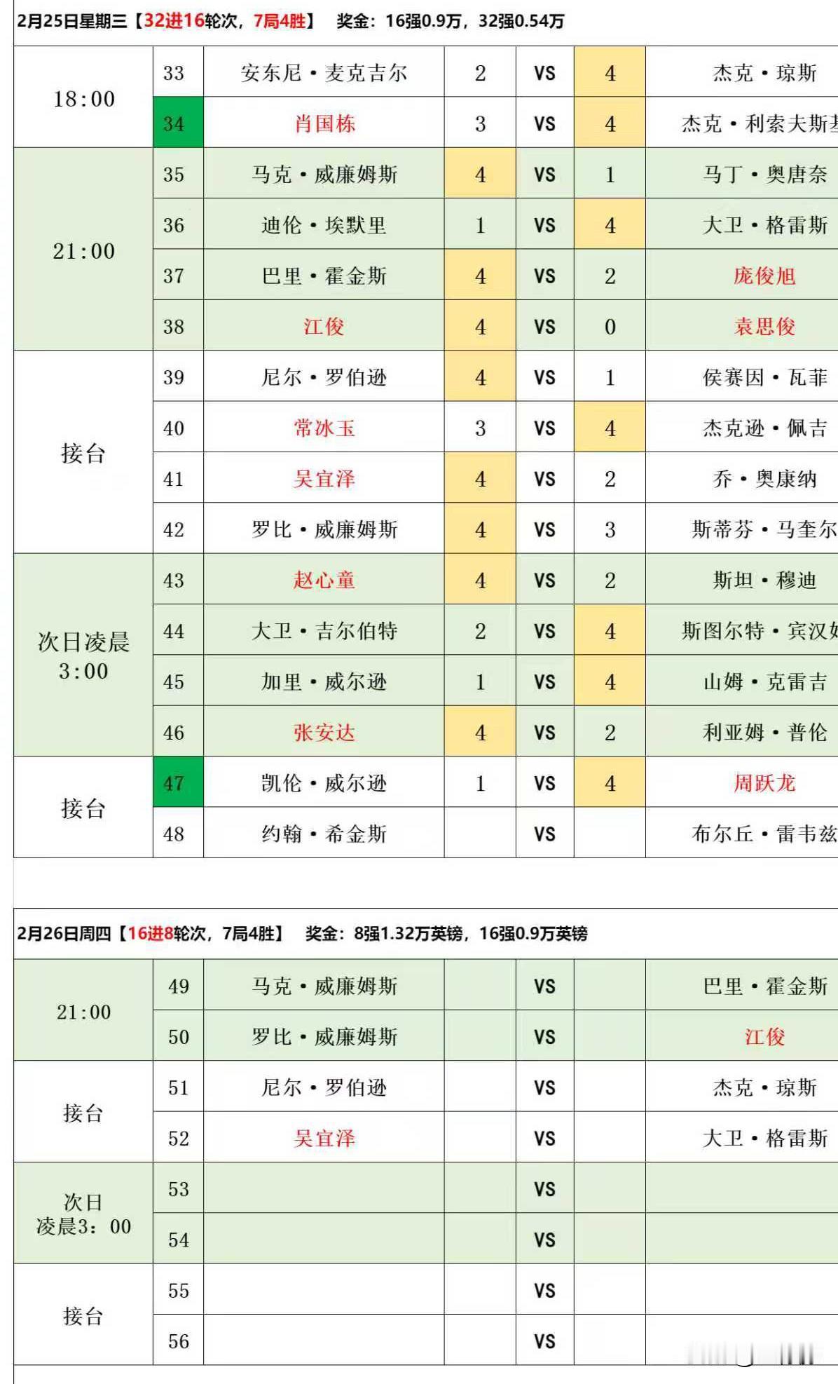 |赵心童 、张安达、吴宜泽、周跃龙、江俊5位中国选手晋级16强。止步32强的中国选手有肖国栋、庞俊旭、常冰玉、袁思俊4位。 26日早上,周跃龙4-1战胜囧哥,成为第五位晋级的中国选手。周跃龙打出3杆50+。 张安达4-2普伦,打出2杆50+。 【16进8轮次签表及比赛时间:】 江俊VS罗比·威廉姆斯,26日21:00 接台:吴宜泽VS格雷斯 斯诺克 一起聊聊斯诺克