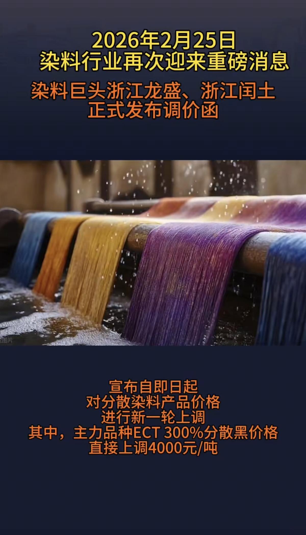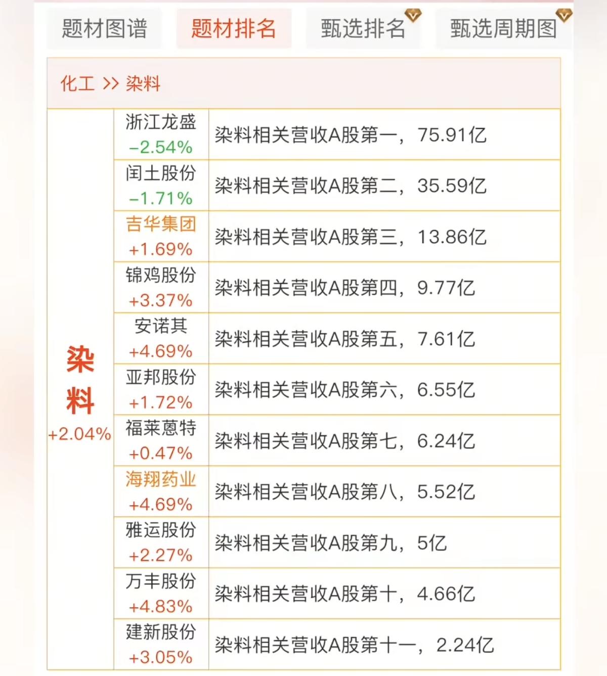 分散染料涨价概念! 分散染料厂家集体上调价格。 化工原料近期成为市场资金追捧热点。 相关核心龙头受益股: