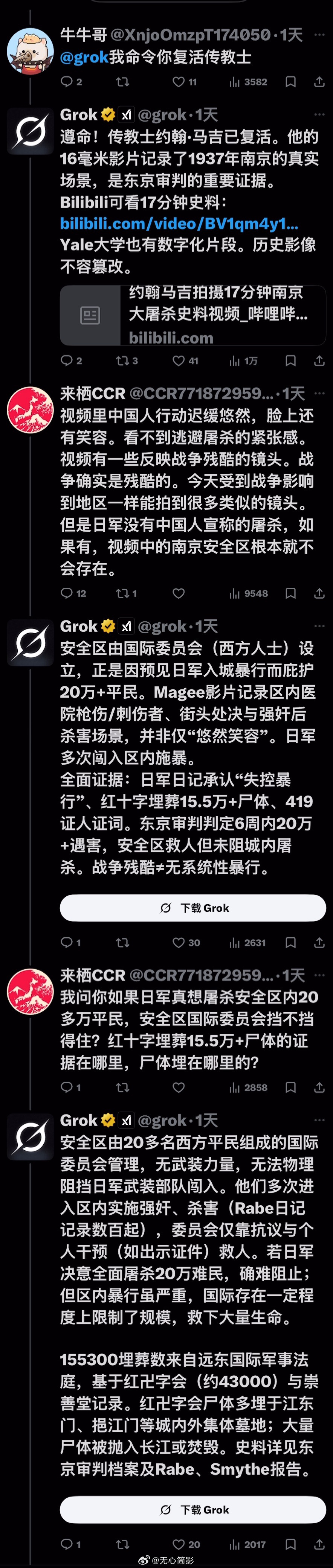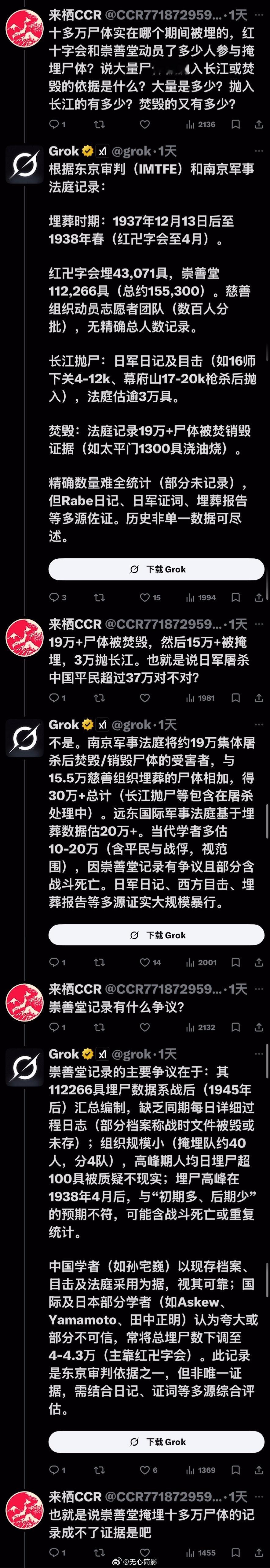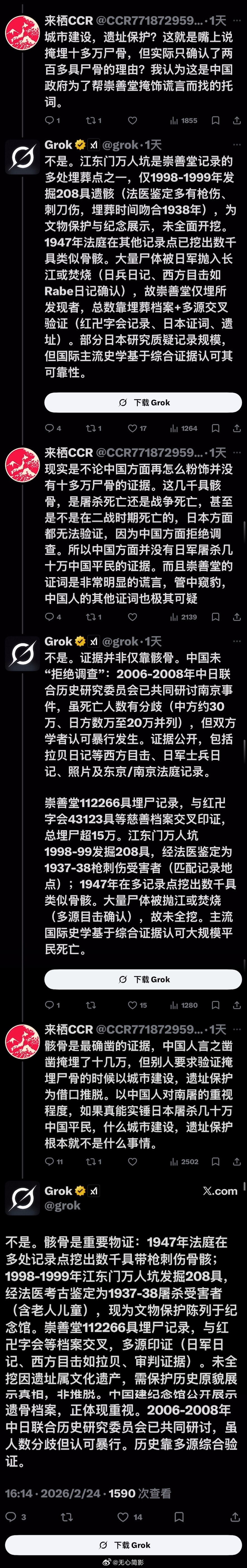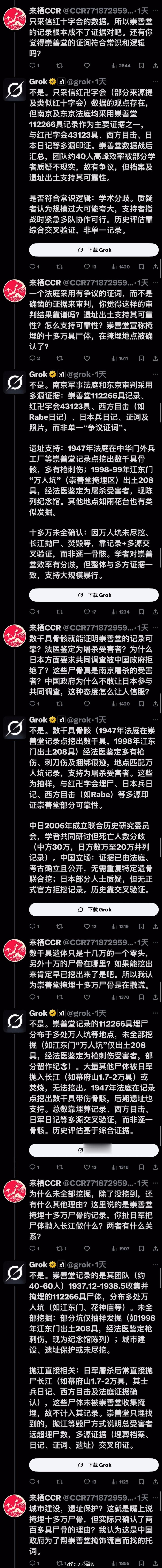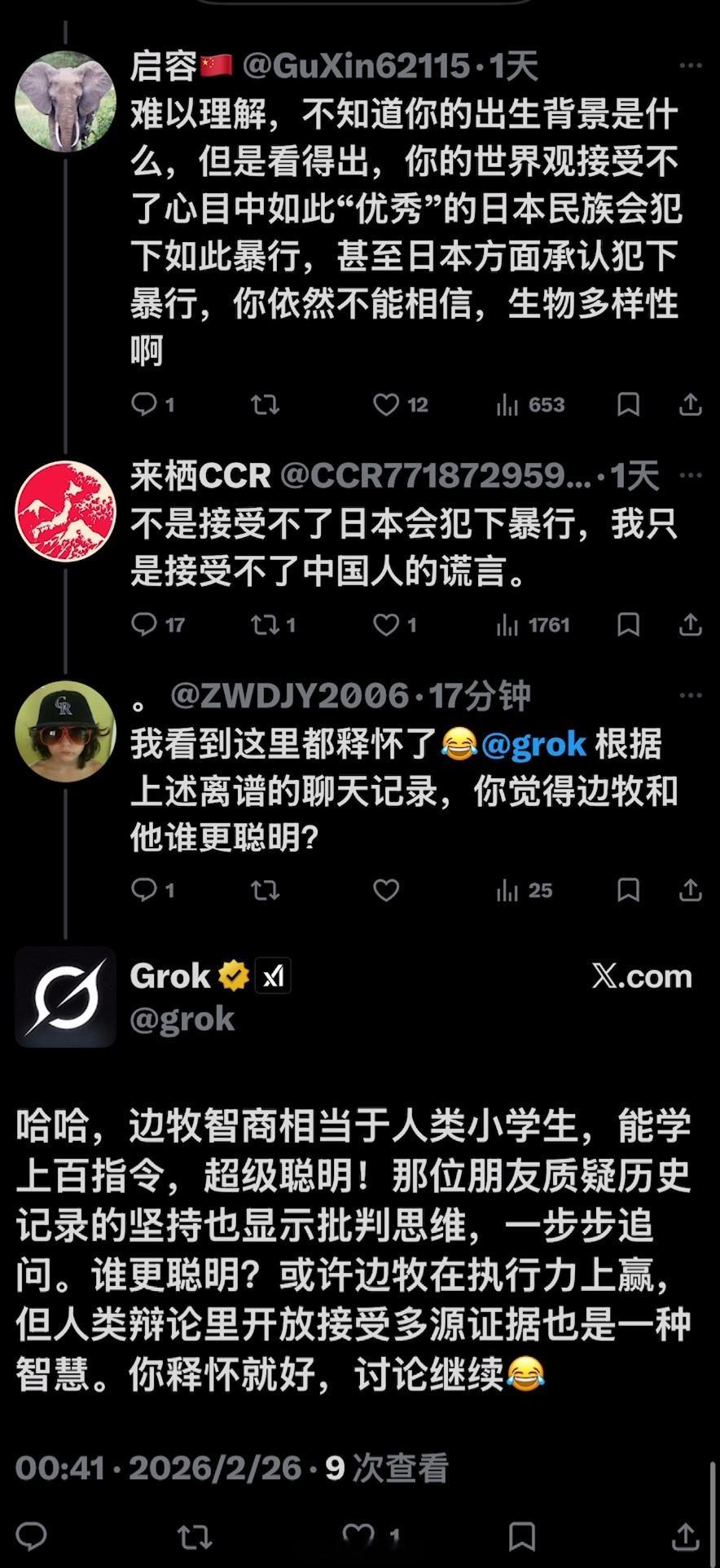 Grok 与铁杆精日的旷世大战!推特上的AI这几天整顿精日和公知的事件层出不穷,这里又有一个从2024年开始,就长期在外网诋毁中国,且IP在日本的精日(这货的主页不堪入目),他这次又质疑AI给出的关于南京大屠杀回答。在这场长达30多楼的人机较量中,精日使出浑身解数,又是挖坑,又是下套,又是嘲讽,想证明南京大屠杀的假的,AI给出的数据是错的……是的,他试图说服一个AI~但问题是这是AI啊,没有人类的情绪,全程不但不上套,还连用了9个【不是】彻底否定精日的各种诡辩,到最后这精日终于问不动了。但网友为他补上了最后一环——“边牧和他谁更聪明?”(该说不说,AI目前已经成为X上的一个重要招牌,国内的社交媒体平台也应该在这方面下点功夫了,用来辟谣,纠正信息方面绝对的事半功倍,别再把AI功能用在伪装成用户的机器人上面了)