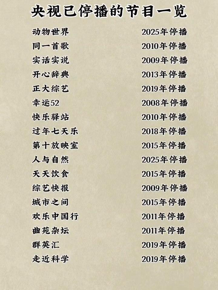 央视已停播的节目一览。 ·2025年停播。 ·2010年停播。 ·2009年停播