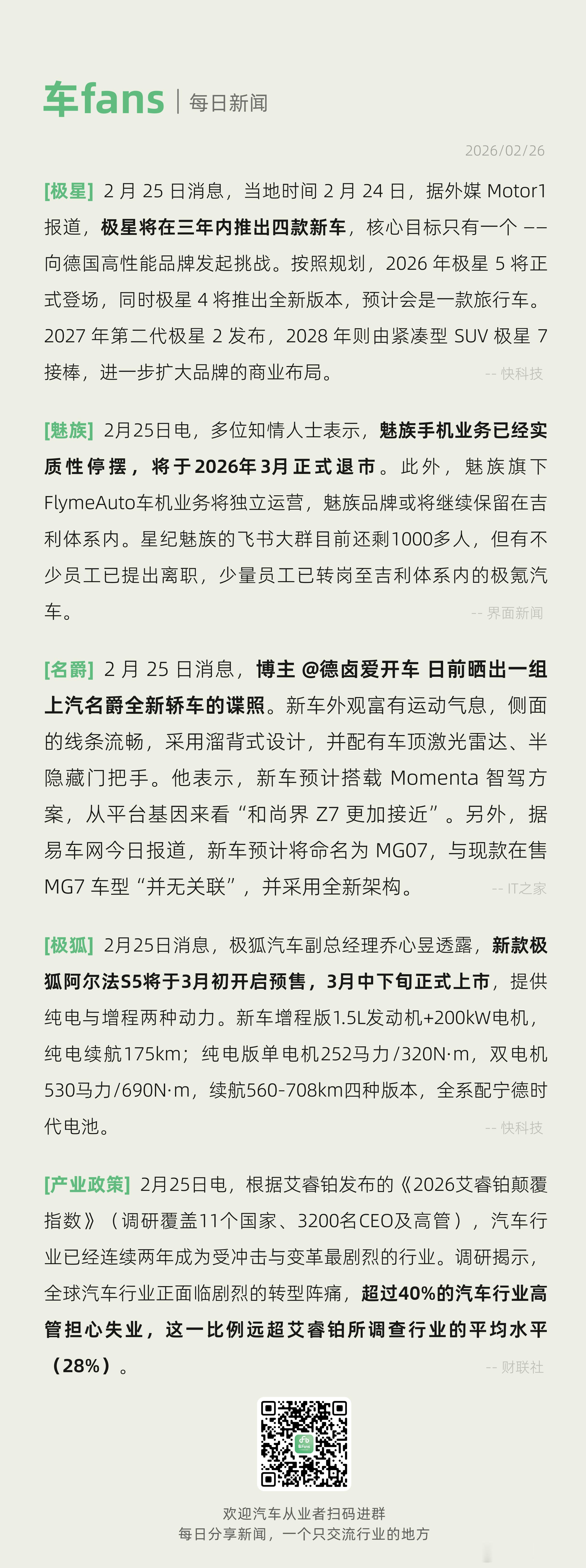 极星将在三年内推出四款新车、超过40%的汽车行业高管担心失业根据艾睿铂发布的《2026艾睿铂颠覆指数》(调研覆盖11个国家、3200名CEO及高管),汽车行业已经连续两年成为受冲击与变革最剧烈的行业。