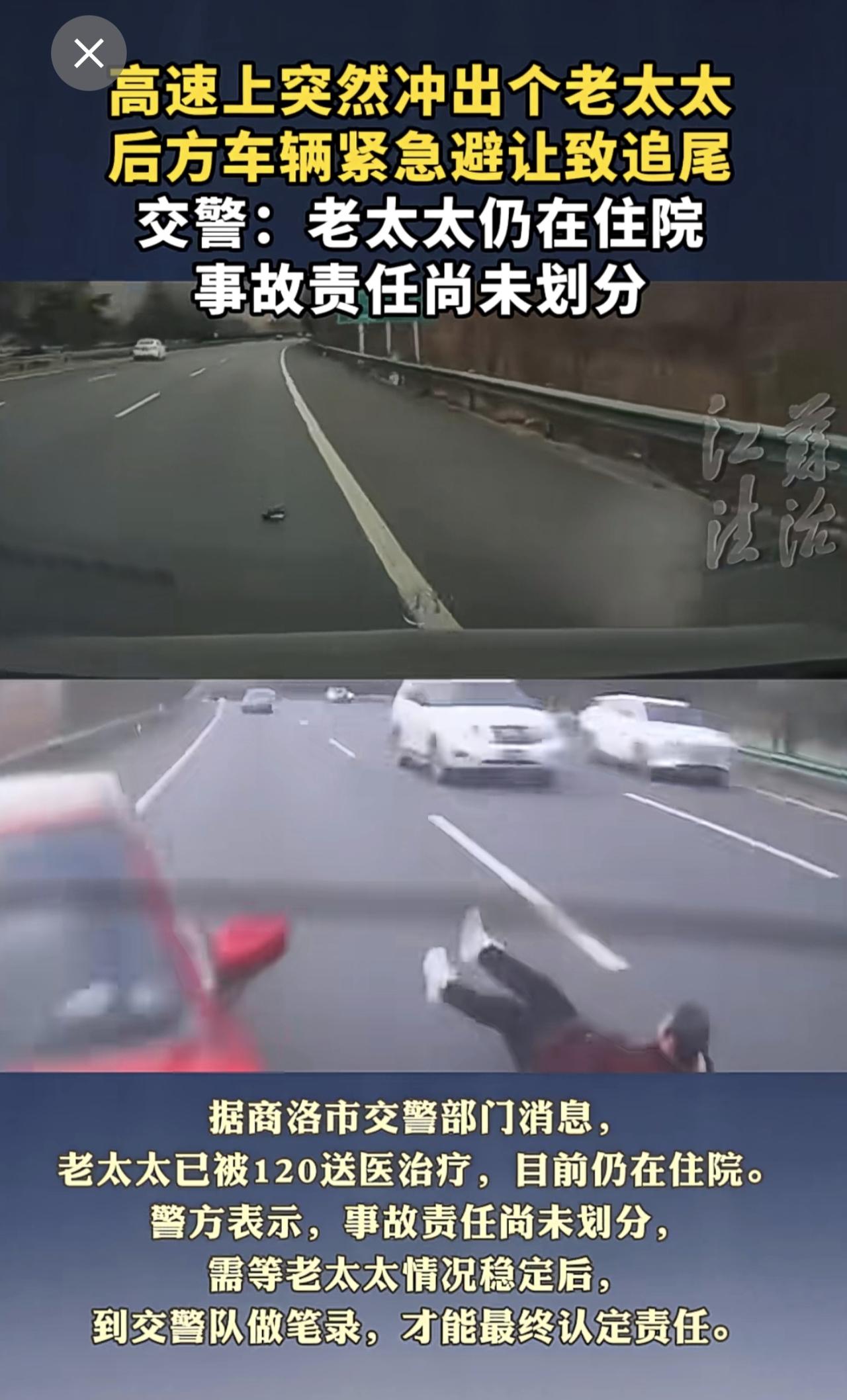 高速上突然冲出个老太太!后方车辆紧急避让致追尾;交警:老太太仍在住院,事故责任尚