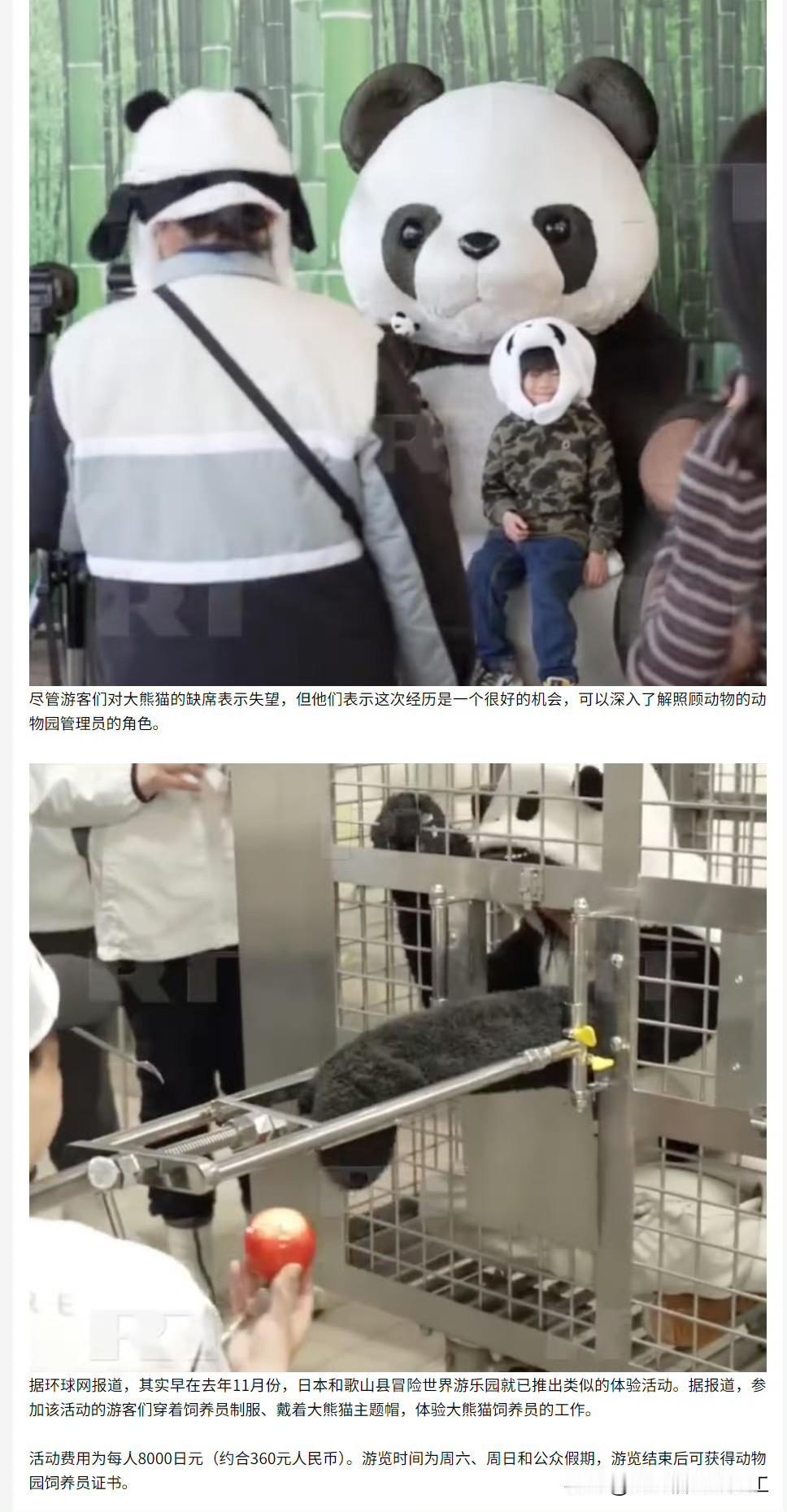 在日本大熊猫清零的背景下,日本动物园推出扮演饲养员,照顾身穿大熊猫服饰的工作人员