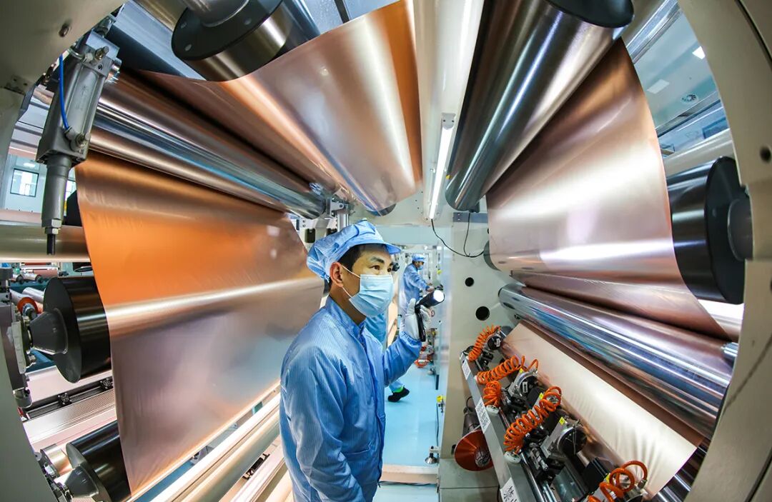 黄石诺德锂电铜箔产业园生产车间里,工作人员有序操作设备生产铜箔周巍/摄