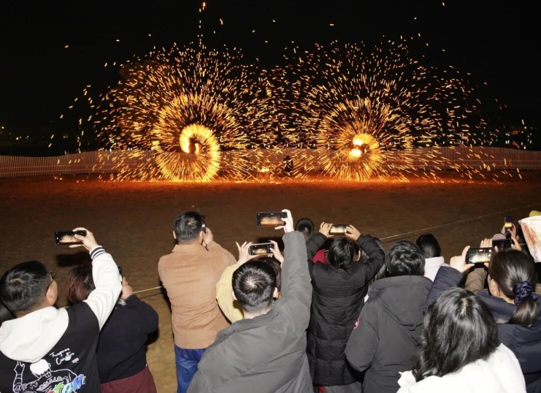 市民游客在未苏湾观看“打铁花”与“铁花风火轮”非遗表演李航/摄