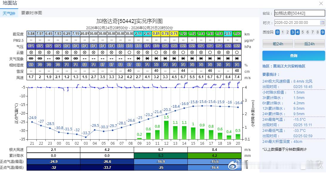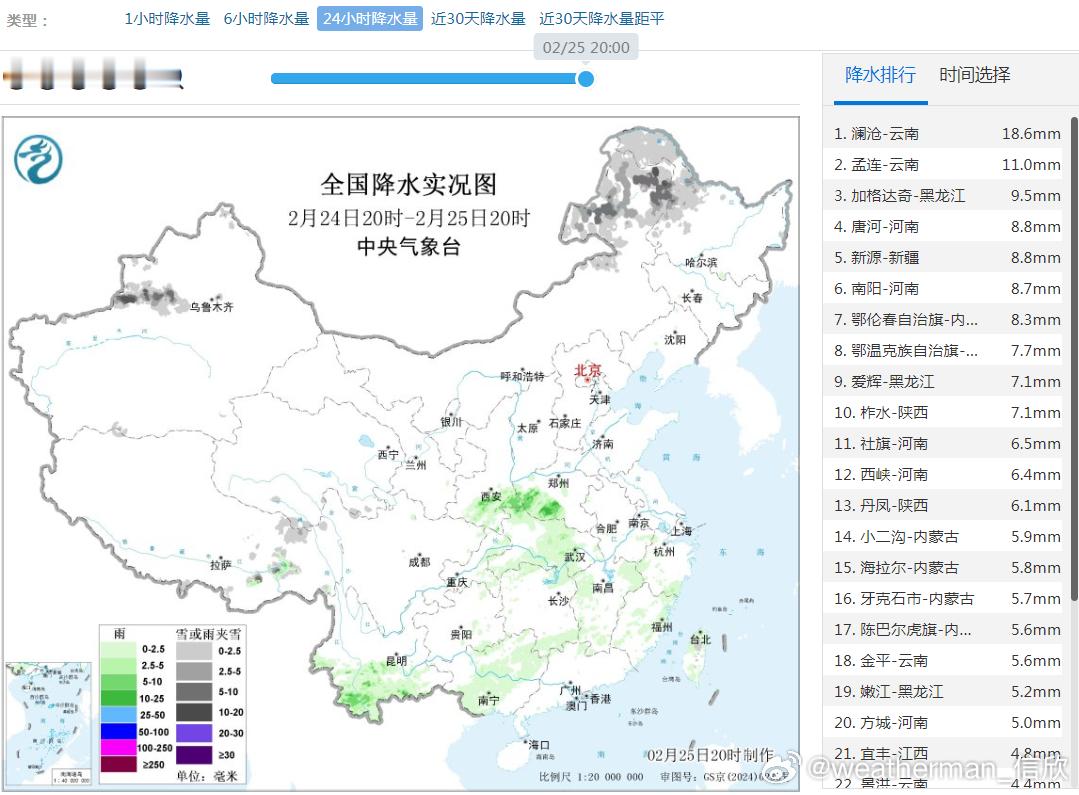 【雨雪】昨晚到今天,内蒙古东部和黑龙江西北部因为气旋影响,出现中到大雪。加格达奇20时积雪48厘米,打破了当地观测史最深积雪纪录。今晚到明天,黑龙江北部黑河一带,可能还有中到大雪。此外新疆天山西段也可能有中到大雪。南方地区今晚到明天,降雨会迅速发展增强。