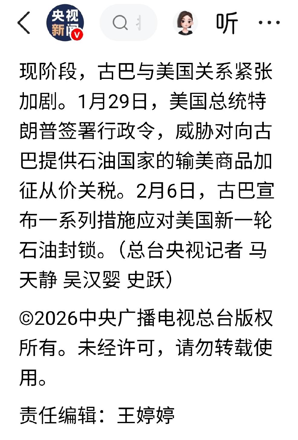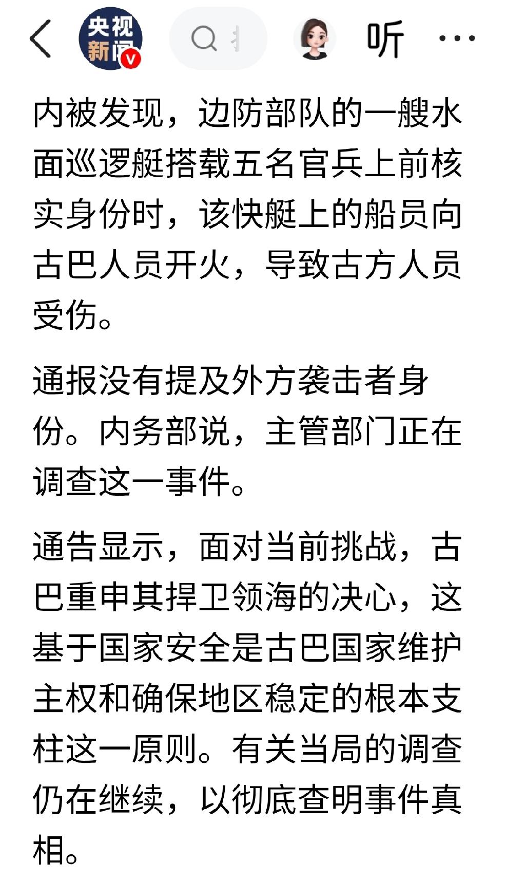2月26日,央视新闻报道,古巴内政部表示,美籍快艇闯入古巴领海并开火,古方还击打死四人。 个人认为:美国这是要把当下的情况制成一个模板-美国套路,以后便依此模板行使霸权。 视某一能源资源为目标,在全世界范围内,依照这种资源的多寡,从多到少,选择目标国家,先是外交恐吓,如不就范就用军事威胁,从而使出侵略战争这一手段,霸占某一能源,随后利用霸占整个资源的产业链,实施强买强卖的做法。在选择目标上采取:盯着目标a,采取外交恐吓;正在实施手段目标b,采用军事威胁甚至是侵略战争;寻找目标c。 看看美国近期的做法就是如此,委内瑞拉是这样,尼日利亚是这样,伊朗是这样,现在又是古巴也是这样。 真就如同美国总统特朗普,在国会所做的演讲一般,美国现在是如此之好,都不知道该怎么办了,疯狂之语。 西方有句谚语,上帝要让某个人灭亡,就要先让这个人疯狂。希望这句谚语,早日实现。