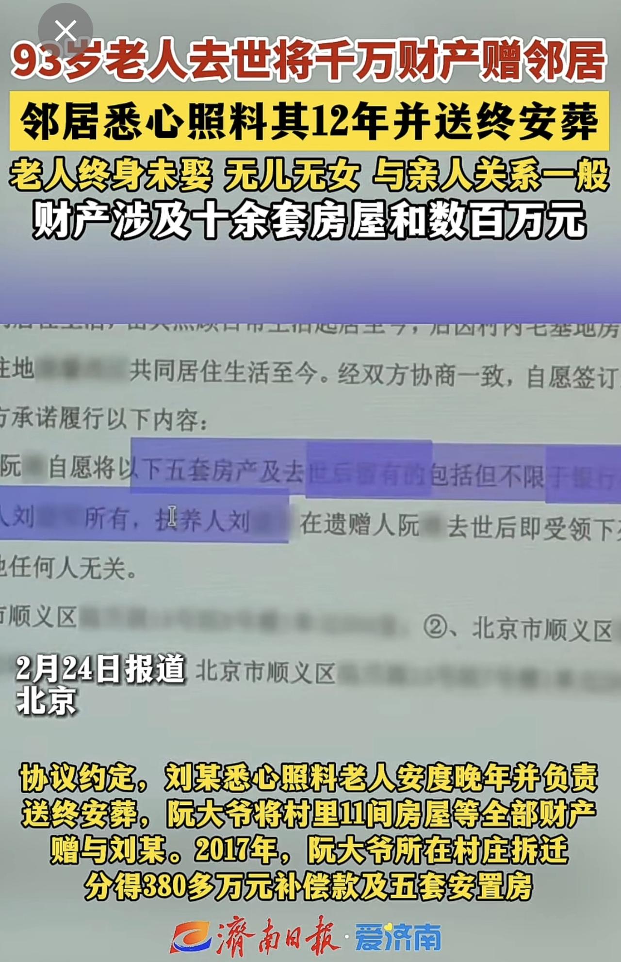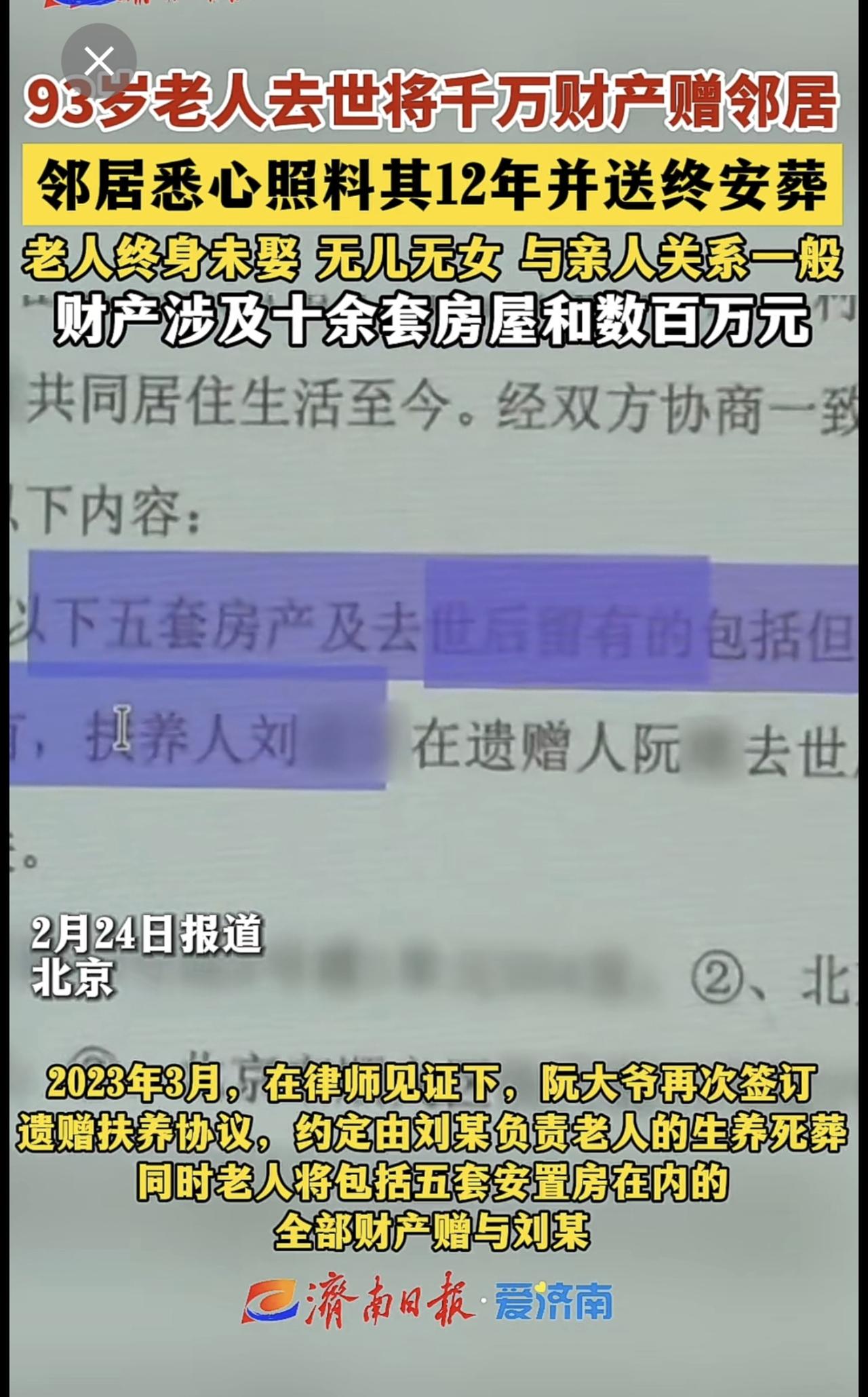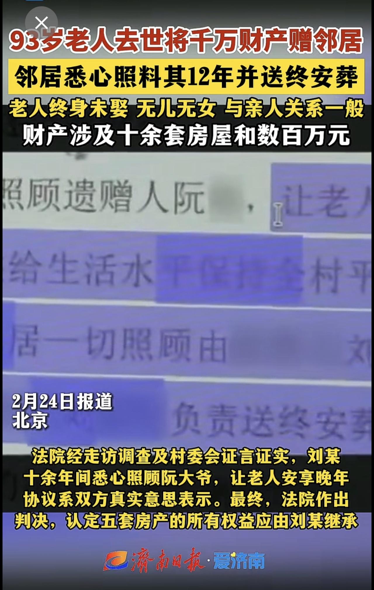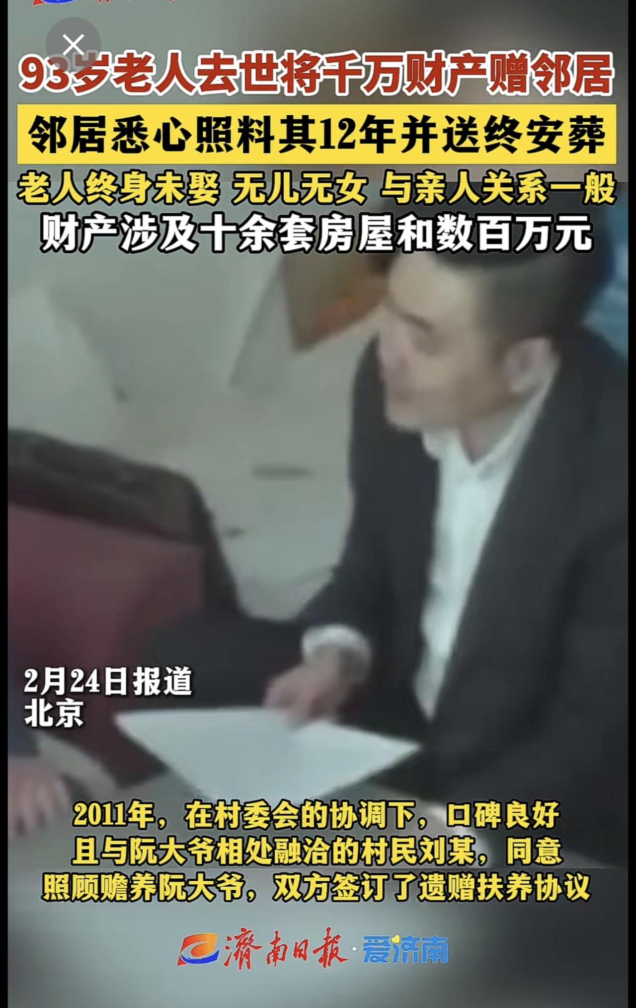 93岁老人去世将千万财产赠邻居 邻居悉心照料其12年并送终安葬 老人终身未娶 无