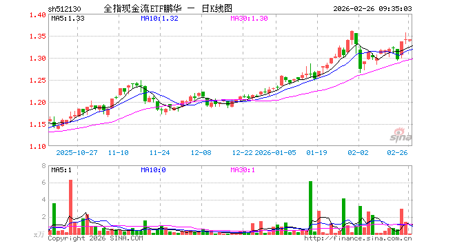 全指现金流ETF鹏华(512130)业绩比较基准为中证全指自由现金流指数收益率,管理人为鹏华基金管理有限公司,基金经理为寇斌权,成立(2025-06-05)以来回报为34.21%,近一个月回报为2.85%。