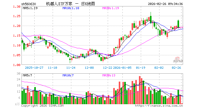 2月26日,机器人ETF万家(560630)开盘跌0.08%,报1.190元。机器人ETF万家(560630)重仓股方面,科大讯飞开盘涨0.02%,汇川技术跌0.35%,拓普集团涨0.01%,大华股份涨0.16%,大族激光涨1.14%,双环传动跌0.47%,石头科技涨0.05%,中控技术跌0.46%,绿的谐波跌1.52%,机器人涨0.06%。