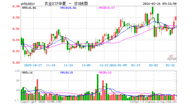 2月26日,农业ETF华夏(516810)开盘涨0.23%,报0.874元。农业ETF华夏(516810)重仓股方面,牧原股份开盘涨0.54%,温氏股份涨2.07%,海大集团跌0.09%,藏格矿业涨2.75%,盐湖股份涨4.50%,亚钾国际跌0.09%,正邦科技涨0.31%,新希望涨0.35%,梅花生物涨0.00%,扬农化工涨0.31%。