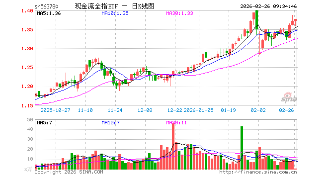 2月26日,现金流全指ETF(563780)开盘涨0.00%,报1.371元。现金流全指ETF(563780)重仓股方面,中国海油开盘跌0.77%,上汽集团涨0.07%,格力电器跌2.57%,中远海控涨0.27%,牧原股份涨0.54%,中国铝业涨1.63%,TCL科技涨0.21%,宝钢股份涨0.57%,长城汽车涨0.00%,正泰电器涨0.09%。
