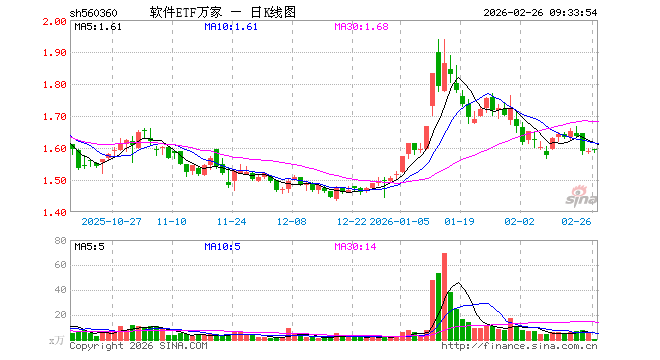 2月26日,软件ETF万家(560360)开盘涨0.38%,报1.596元。软件ETF万家(560360)重仓股方面,科大讯飞开盘涨0.02%,金山办公涨0.00%,同花顺跌0.45%,指南针涨0.12%,恒生电子涨0.50%,拓维信息涨0.06%,润和软件涨0.37%,三六零跌0.16%,软通动力涨0.21%。