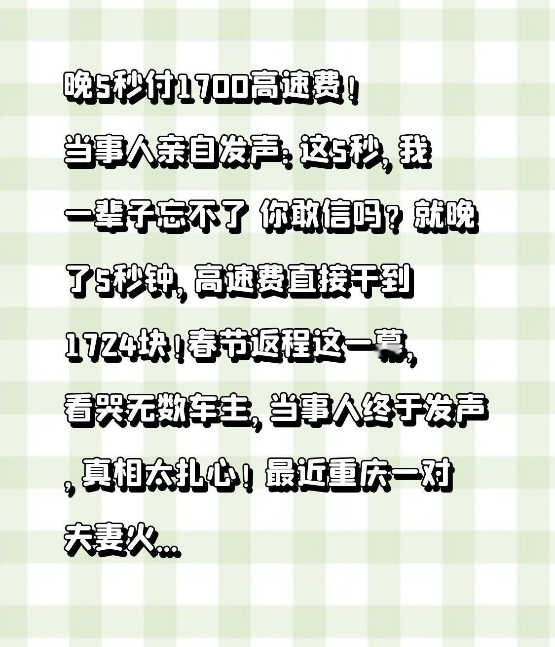 晚5秒付1700高速费!当事人亲自发声:这5秒,我一辈子忘不了 你敢信吗?就晚了5秒钟,高速费直接干到1724块!春节返程这一幕,看哭无数车主,当事人终于发声,真相太扎心! 最近重庆一对夫妻火了,从新疆喀什自驾回重庆,全程3700多公里,开了40多个小时,就为赶春节高速免费末班车。夫妻俩算得明明白白,提前半小时就往收费站冲,心想稳了!谁能想到,返程高峰堵成一锅粥,匝道缓行、车流扎堆,时间一分一秒逼近零点,夫妻俩手心都攥出汗。 就在车子驶过ETC闸机那一秒,时间精准跳到00:00:05!屏幕一亮,收费1724元,夫妻俩当场懵了。免费资格直接清零,系统自动判定全程收费,一分不少。工作人员也无奈:规则就是按驶离出口时间算,精确到秒,差一秒都不行,全国联网系统改不了。 本以为能省一笔,结果5秒亏掉近两千,比油费还贵!当事人哭笑不得:又气又好笑,真是花钱买教训。这事一出,全网炸锅!网友纷纷吐槽:我晚1分钟多花600;我卡点最后一秒过,全车欢呼;这是史上最贵5秒钟! 很多车主都踩过坑:以为上高速免费就行,大错特错!高速免费只看下高速时间,不看上高速时间。零点前出站,全程免费;零点后出站,哪怕晚1秒,全程收费,没有缓冲,没有例外。 有人说规则太死板,有人说必须守规矩。但说到底,这不是抠不抠的问题,是无数车主返程的心酸。千里奔波、熬夜赶路,就为省点钱,却被几秒钟卡住,换谁都心疼。 当事人也提醒大家:节假日走高速,千万别卡点!多预留1小时,提前下高速,别赌那几分钟,更别抢速危险驾驶。钱能再赚,平安最重要。 看完这事,你还敢卡点下高速吗?你有没有高速免费踩坑的经历?评论区聊聊,给更多车主提个醒!