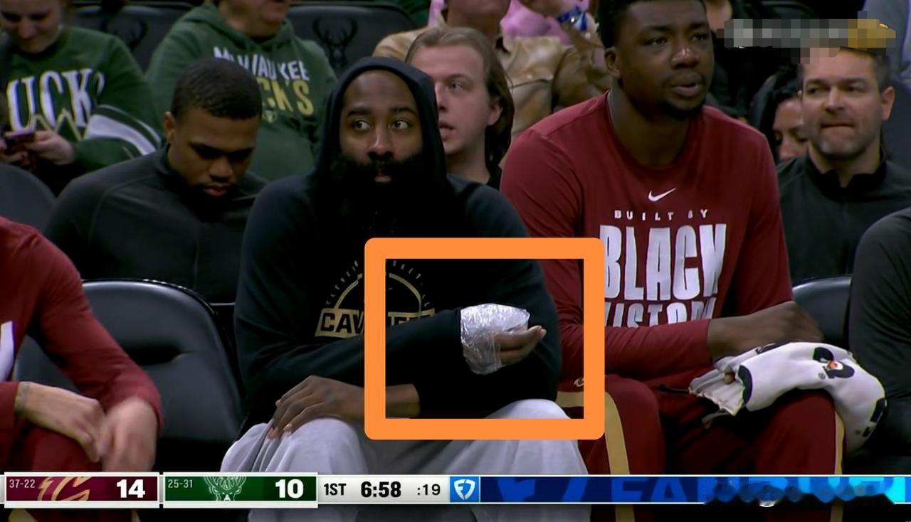 骑士巨星哈登真是太让人心疼了!在今天骑士客场挑战雄鹿的比赛中,当时比赛进行到了第一节的6分58秒,骑士以14:10领先对手4分。这个时候转播镜头给到了骑士的替补席,只见此役因伤缺阵的哈登神情落寞的坐在场下,他的右手拇指处已经缠上了厚厚的纱布,让人看着特别的心疼。希望哈登能够早日康复重返赛场,骑士真的离不开哈登。