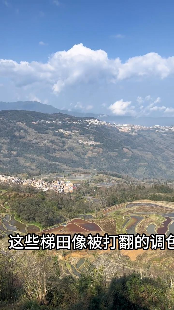 哈尼族梯田老县城彩色梯田区。 各位朋友,现在我们站在元阳梯田的罗马村观景台,这里视野不算开阔,却藏着最动人的色彩。 眼前这片层层叠叠的水田就是哈尼族人用千年时光雕琢的彩色梯田。这些梯田像被打翻的调色盘,红的是蓄了水的泥田,绿的是刚冒芽的秧苗,蓝的是倒映着天空的镜面,褐的是刚翻耕过的沃土。每一道田埂都是哈尼人顺着山势画出的曲线,把大山变成了可以耕种的艺术品。 顺着我的手指方向,远处山顶上那片错落有致的房屋就是老元阳县城新街镇。它建在海拔1400米的山巅,像一颗嵌在云端的明珠,守望着脚下的梯田千百年。而在它的另一侧,隐约可见的开阔河谷地带就是新元阳县城南沙镇的方向。 这两座城一个在山顶,一个在河谷,一个守着千年的农耕文明,一个开启着现代的生活。站在这里你能同时触摸到历史与未来。脚下的梯田是哈尼族写给大地的诗,远处的新城是时代写给这片土地的信。而我们正站在这诗与信的交汇处,感受着人与自然最和谐的共鸣。