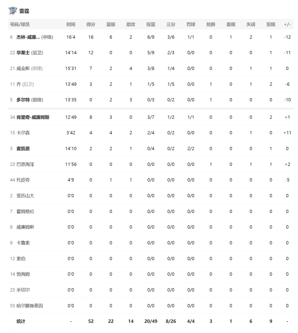 一度领先12分的雷霆在第二节被反超,以52-58落后活塞进入第三节!杰林9中6砍下16分2助攻2失误,卡森华莱士9中5拿到12分,阿龙维金斯7分4助攻,肯威8分3篮板,卡尔森4+4+2,麦凯恩4中0和多尔特3中0没有得分,以赛亚乔三分5中1拿到3分。