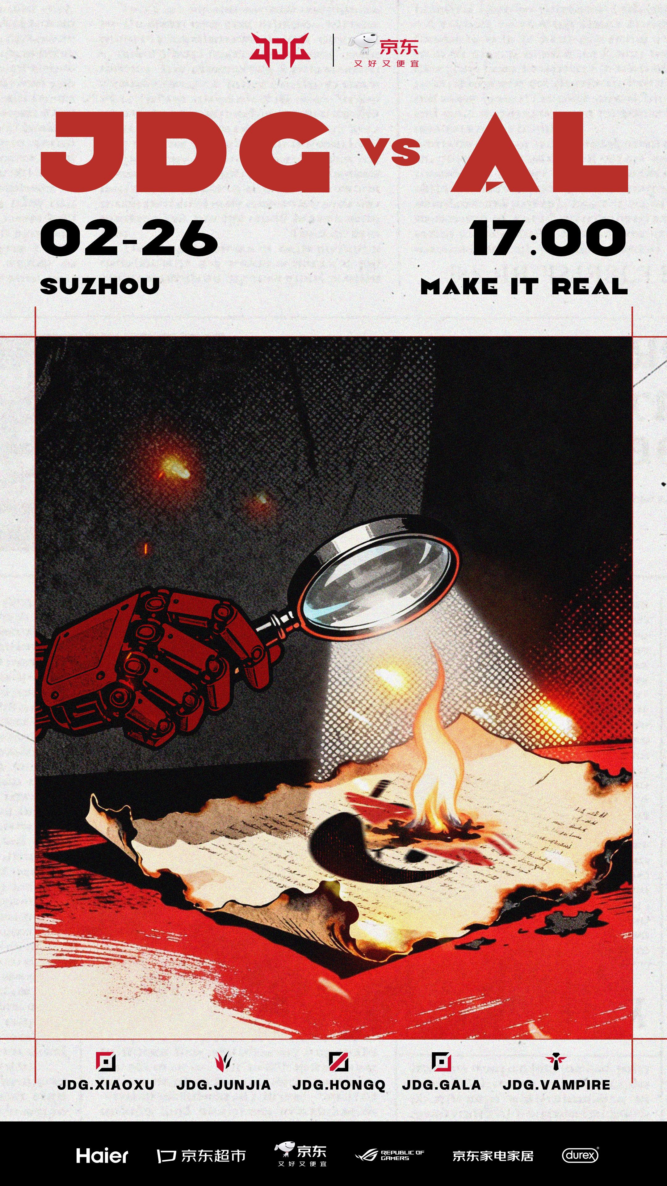 虎扑02月26日讯2026LPL第一赛段淘汰赛AL对阵JDG的比赛将于今日17:00开赛。两队官方社媒发布赛前预热海报。