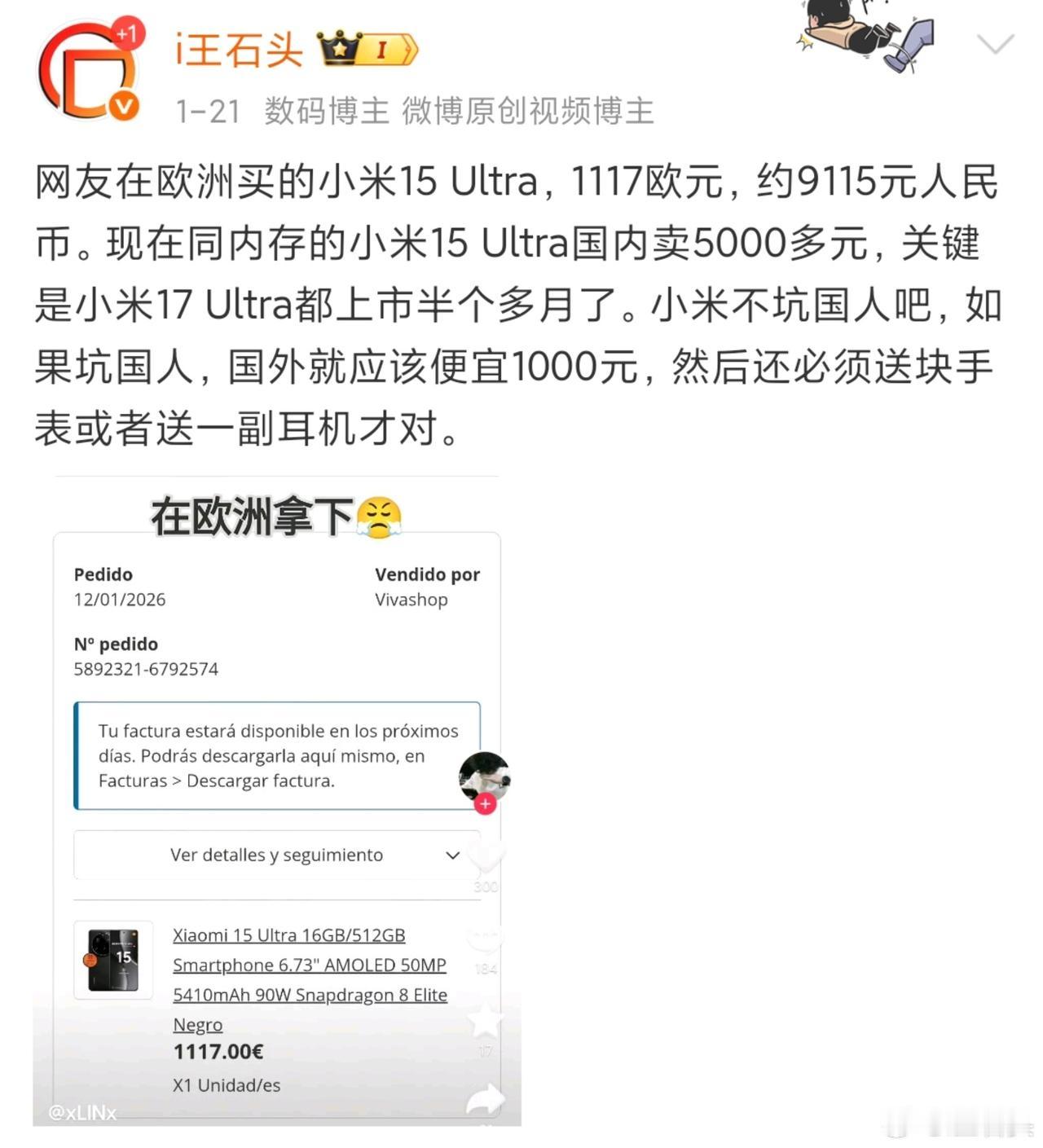 前阵子看到有网友分享在欧洲拿下小米15 Ultra,1117欧元,约9115元人民币。 而国内市场小米17 Ultra去年年底就发布了,但欧洲消费者要等三个月才能买到。 现在曾学忠和卢伟冰都说了,小米17系列将于2月28号在巴塞罗那见。 其实你们现在看到的第三方公布的小米17系列销量,包括小米15系列销量,都是统计的国内激活量,海外市场的销量没有算在其中。 目前小米17系列的销量已突破340万台,整个生命周期国内销量不会比上代差吧,再加上海外销量,卖1000万台不过分吧!