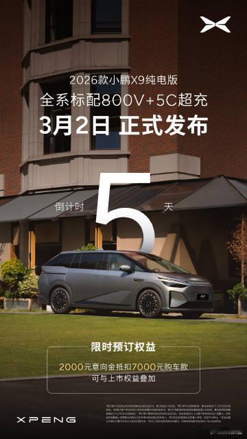 小鹏第二代VLA在3月2日发布3月2日14:00小鹏将发布第二代VLA,同步推出2026款X9纯电版,该车为全球续航最长5C纯电大七座。2026款小鹏X9纯电版将搭载第二代VLA