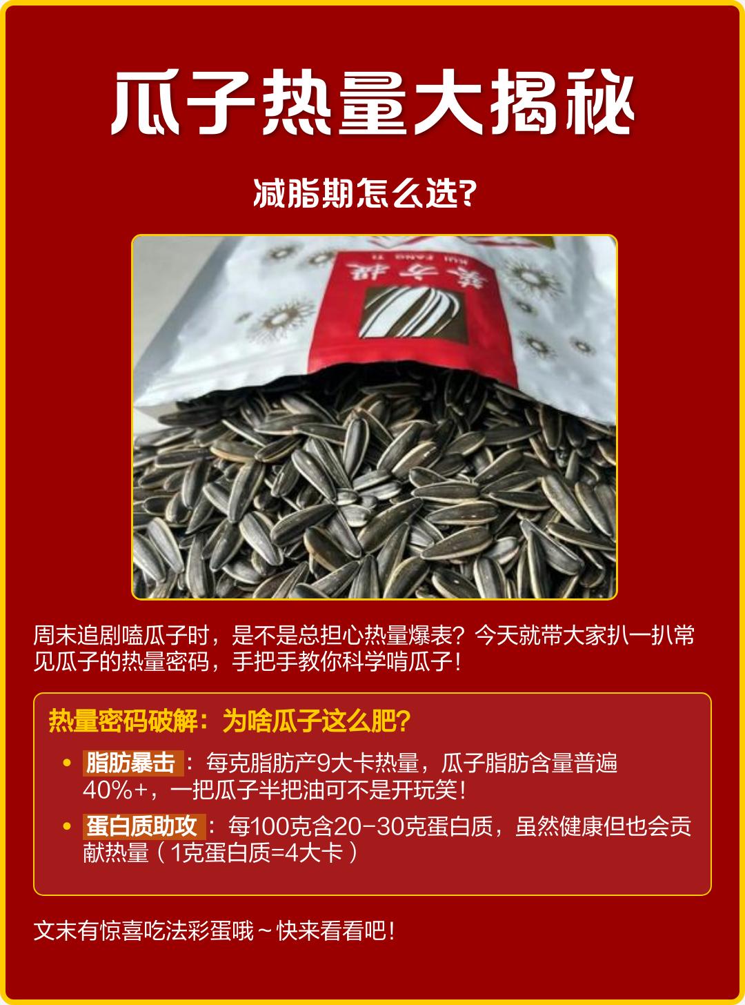 春节嗑瓜子别上头!1把=半碗饭,这些危害很多人忽略了 春节宅家,谁能拒绝一把香香脆脆的瓜子?追剧、聊天、走亲戚,手上总少不了它,但你知道吗,这不起眼的小瓜子,竟是“热量刺客”! 专家提醒:一把瓜子(约25克)热量就有150千卡,相当于半碗米饭,或是一小勺油!要是一不小心炫完200克,热量直接超1200千卡,占成年女性一天所需热量的一半! 更要注意的是,五香、焦糖等调味瓜子,除了高脂,还加了大量盐和糖,吃多了容易腹胀、消化不良,严重时甚至可能诱发急性胰腺炎。 长期用牙嗑壳,还会磨出“瓜子牙”,口腔黏膜反复摩擦也容易破损溃疡。 过年解馋可以,但别贪多!建议每天只吃一小把,优先选原味的,尽量用手剥,别让快乐零食变成健康负担!