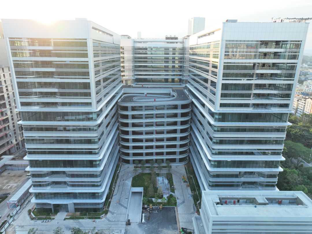 据介绍,红花岭基地是南山区推进“工业上楼”理念的典型实践,项目一期总建筑面积70.55万平方米,容积率为6.71,共计16层,首层层高达8米,2—9层的层高为6米,9层以上为4.5米;荷载采用分级设计,首层达2吨/平方米,中间平台层达1.5吨/平方米,其余楼层均在0.8—1.0吨/平方米之间;配合8.7—10.9米的大柱网设计,能适配大型自动化设备与高端先进生产线的布局需求,让“摩天工厂”具备承载重型制造的硬实力。同时,借助螺旋盘道贯通不同楼层,创新实现“多首层”概念,将传统的平面空间转化为高效的立体空间,使货车可直接抵达多个楼层卸货,极大提升物流效率。