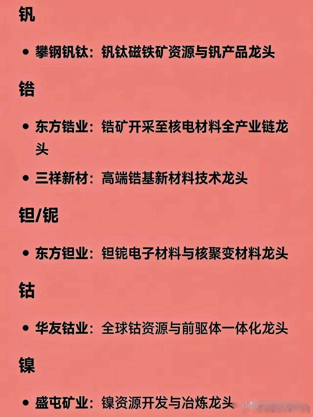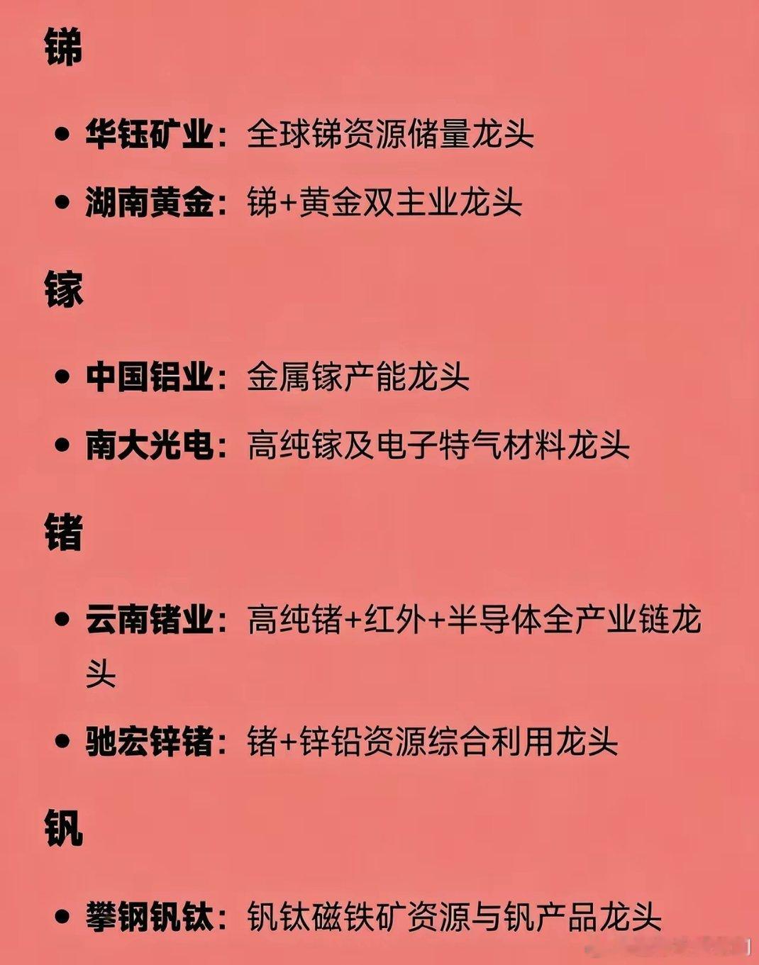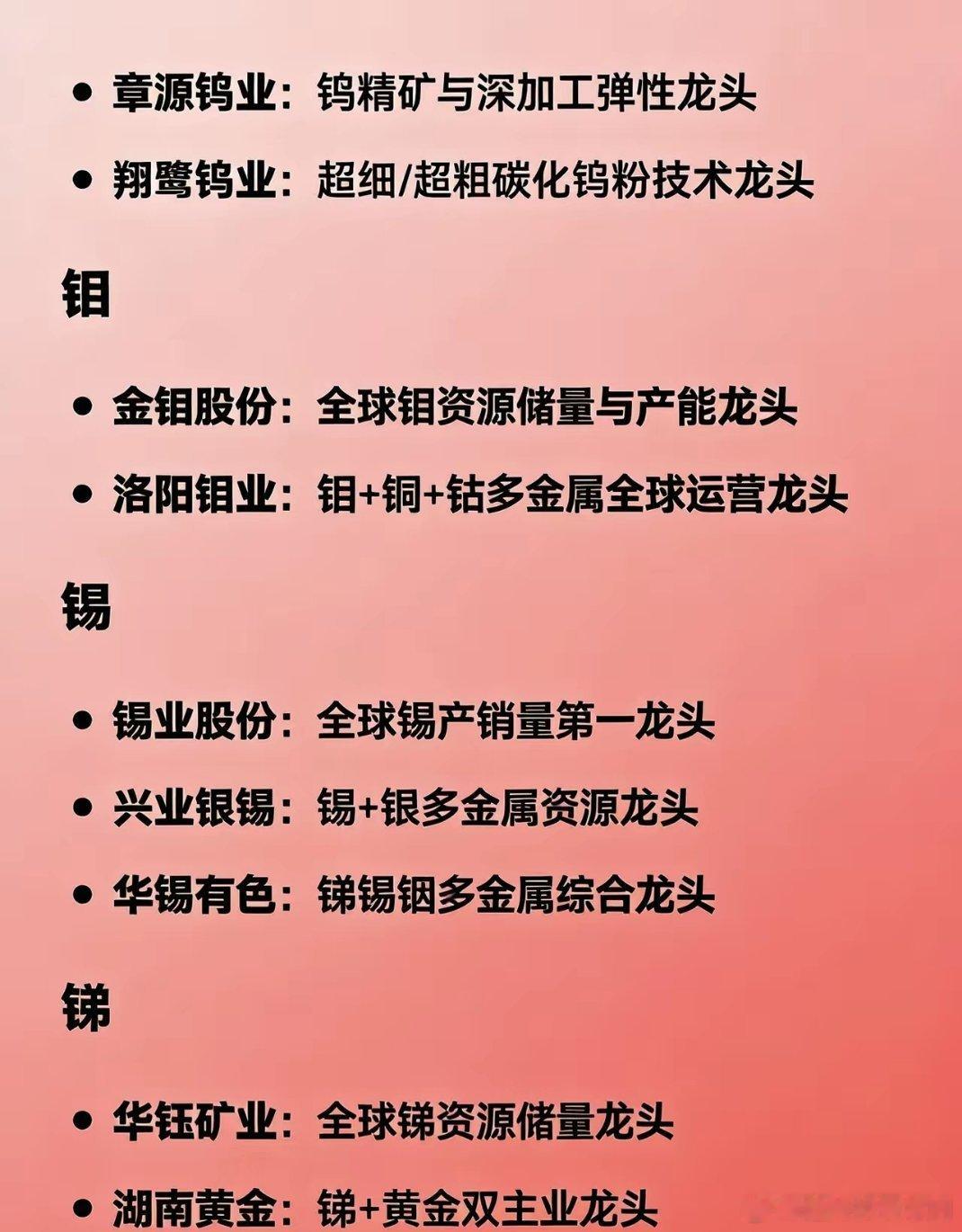 小金属龙头股·精简汇总稀土- 北方稀土:轻稀土龙头- 中国稀土:冶炼分离龙头- 广晟有色:中重稀土龙头- 盛和资源:海外稀土布局龙头钨- 中钨高新:钨全产业链龙头- 厦门钨业:钨+稀土+锂电综合龙头- 章源钨业、翔鹭钨业:钨深加工龙头钼- 金钼股份:钼资源产能龙头- 洛阳钼业:钼铜钴多金属龙头锡- 锡业股份:全球锡业龙头- 兴业银锡、华锡有色:锡多金属龙头锑- 华钰矿业:锑资源龙头- 湖南黄金:锑+黄金双主业镓- 中国铝业:镓产能龙头- 南大光电:高纯镓龙头锗- 云南锗业:锗全产业链龙头- 驰宏锌锗:锗锌综合龙头钒- 攀钢钒钛:钒产品龙头锆- 东方锆业:锆全产业链龙头- 三祥新材:高端锆材龙头钽/铌- 东方钽业:钽铌电子材料龙头钴- 华友钴业:钴&前驱体龙头镍- 盛屯矿业:镍资源龙头铟- 株冶集团:铟回收龙头镁- 云海金属:镁合金龙头钛- 宝钛股份:高端钛合金龙头- 西部材料:钛材加工龙头
